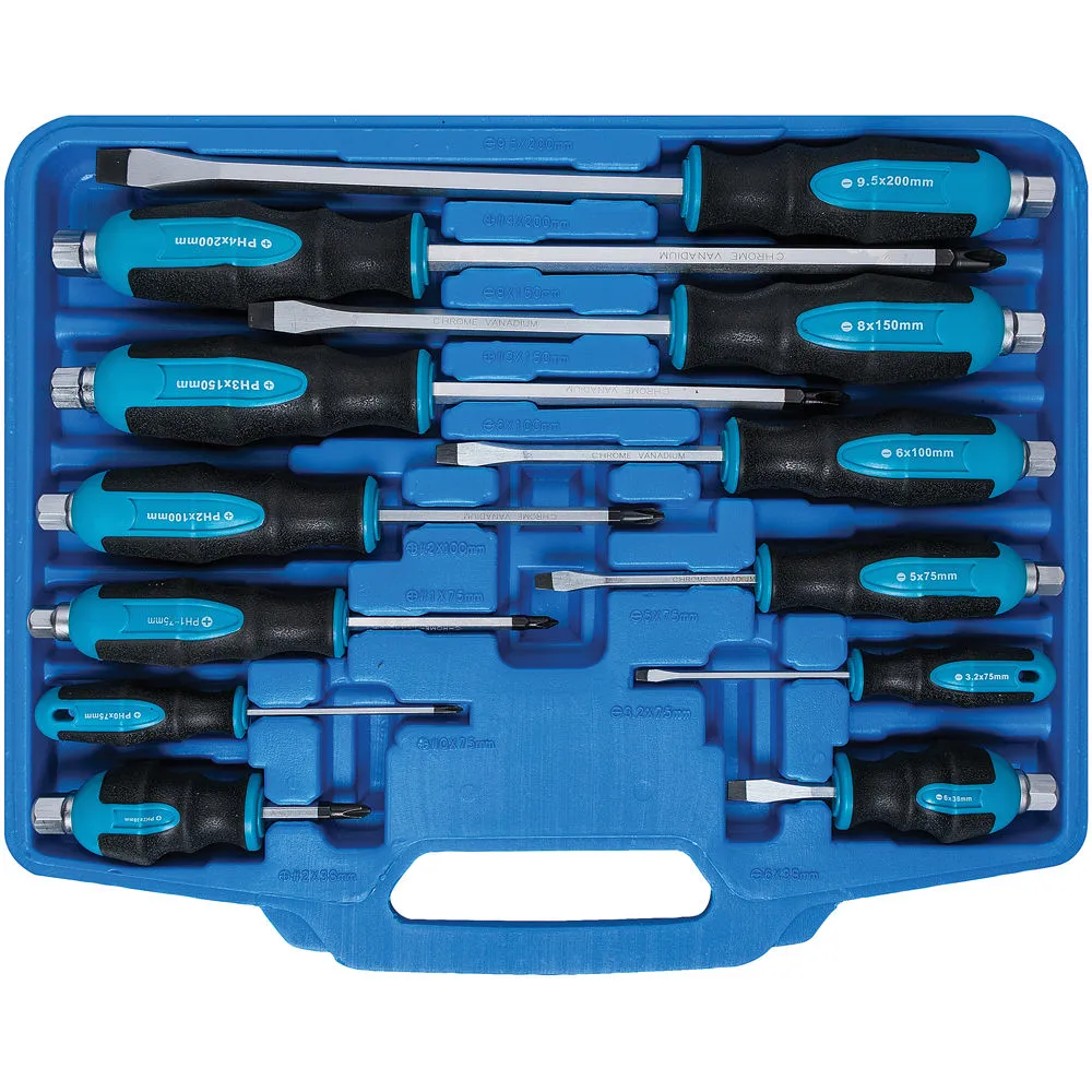 This 12 piece Hex Bolster Screwdriver Set is manufactured from chrome vanadium steel and features a hex shaft and a bolster on the screwdriver handle so you can apply high levels of torque. The drivers feature a heavy duty soft grip handle to aid grip and comfort for the user.