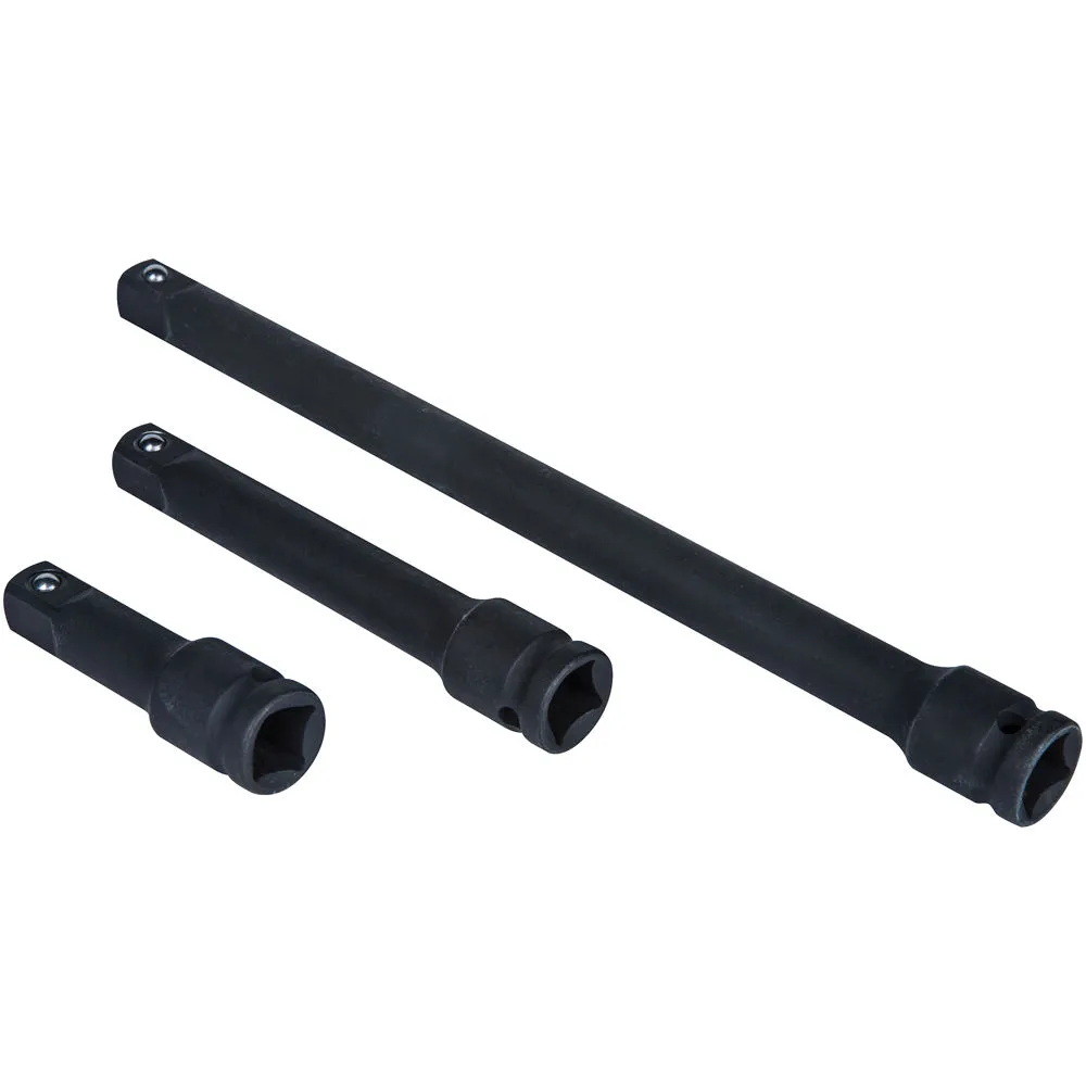 This 3 Piece 1/2″ Impact Extension Bar Set is drop forged from heat treated Chrome Vanadium Steel with a blackened Phosphate coating to protect from corrosion.
