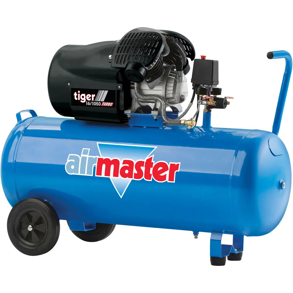 The Airmaster Tiger 16/1050 air compressor is a large 100 litre, portable compressor particularly useful for large scale spraying. It is ideal for workshop and DIY applications such as spraying (paint, varnish, preservatives etc.), nailing, stapling, polishing, sanding and garage use. This compressor is fitted with safety valve and pressure regulator with gauge for controlled air pressure. With twin air outlets for increased versatility, this air compressor is ideal for most tasks.
