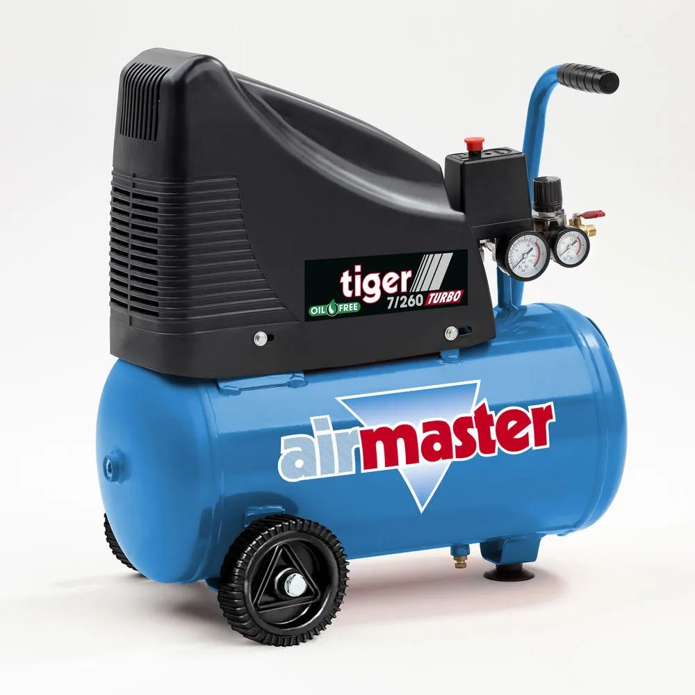 The Airmaster Tiger 7/250 is fitted with fully automatic on/off control, safety valve and pressure regulator offering additional safety and is supplied with 2x wheels with fixings and, 2x rubber feet. Our best-selling range of Airmaster compressors are compatible with many types of air tools, constructed to the highest standard of quality, safety and durability and are provided with a 12-Month manufacturers guarantee.