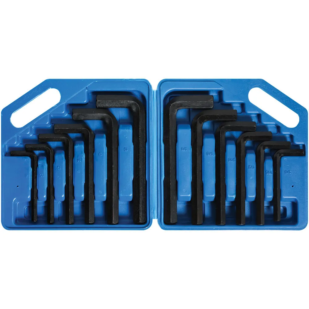 The set includes both metric (mm) sizes and imperial (“) sizes. Supplied in a blow molded case which holds each key securely in a marked slot for rapid identification.