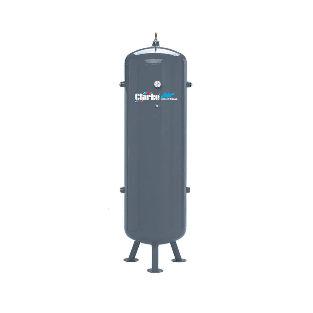 A top quality vertical air receiver from Clarke, manufactured for use with Clarke’s range of industrial screw compressors, refrigerant dryers and other air powered tools and equipment. Including multiple outlets at the top, base and sides. Manufactured to 2009/105/EC standards. Complete with a pressure gauge and safety valve.