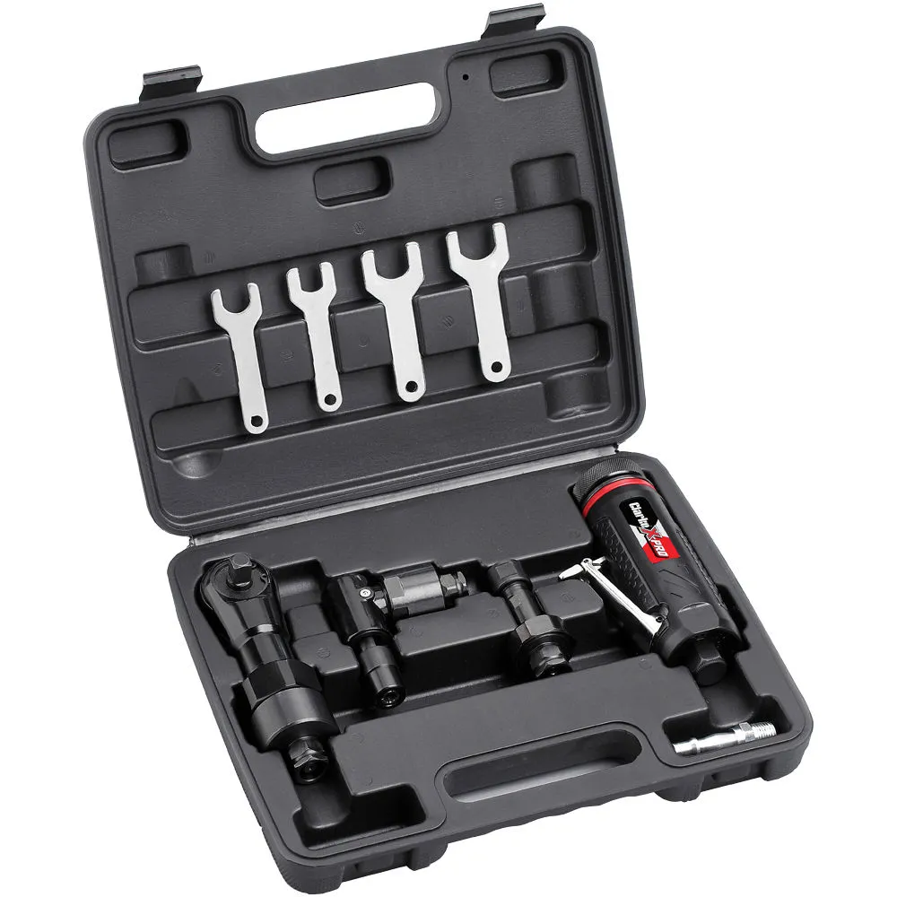 3-in-1 professional air tool kit which can be used as either a 3/8” ratchet wrench or a ¼” die grinder. Made in a composite material for durability and comfort. This kit comes complete with a blow mould case, main body, die grinder, angle die grinder and 3/8” air ratchet wrench attachments.