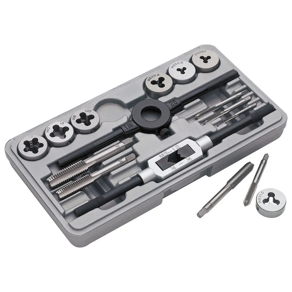 For automotive and general mechanical workshop use this 16 piece tap and die set, made from high quality tungsten steel, will serve to create and repair popular metric threads.