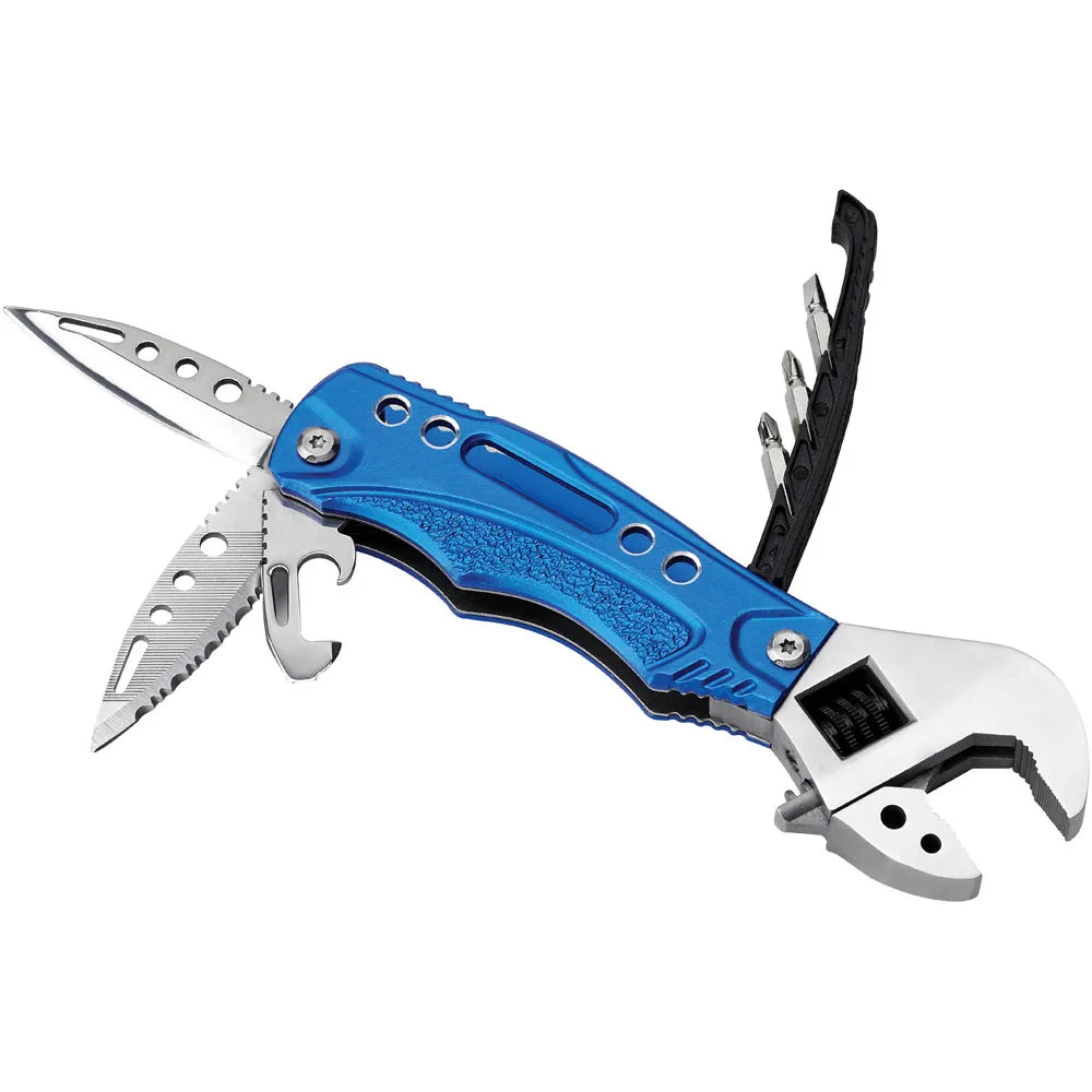 The Clarke CHT906 is a 10 in 1 multitool that features 3 screwdriver bits, a can opener, a bottle opener, serrated knife, knife, and a spanner flat screw driver. This unit is manufactured from stainless steel and has a built in LED light for added versatility.