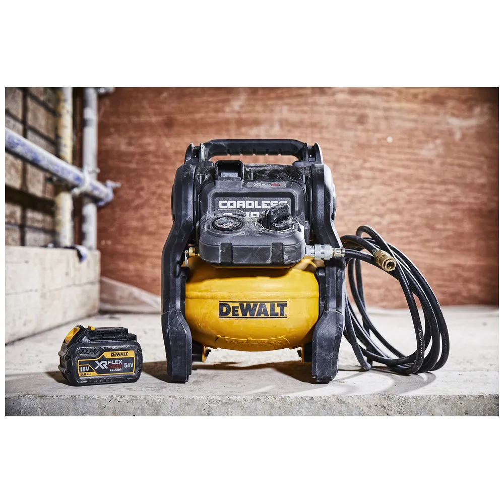 The DEWALT 54V XR FLEXVOLT 10L Air Compressor (Bare Unit) has been constructed with an oil free motor for high reliability and reduced maintenance. The OneTurn ™ regulator offers fast and straightforward adjustment that enables a quicker setup.