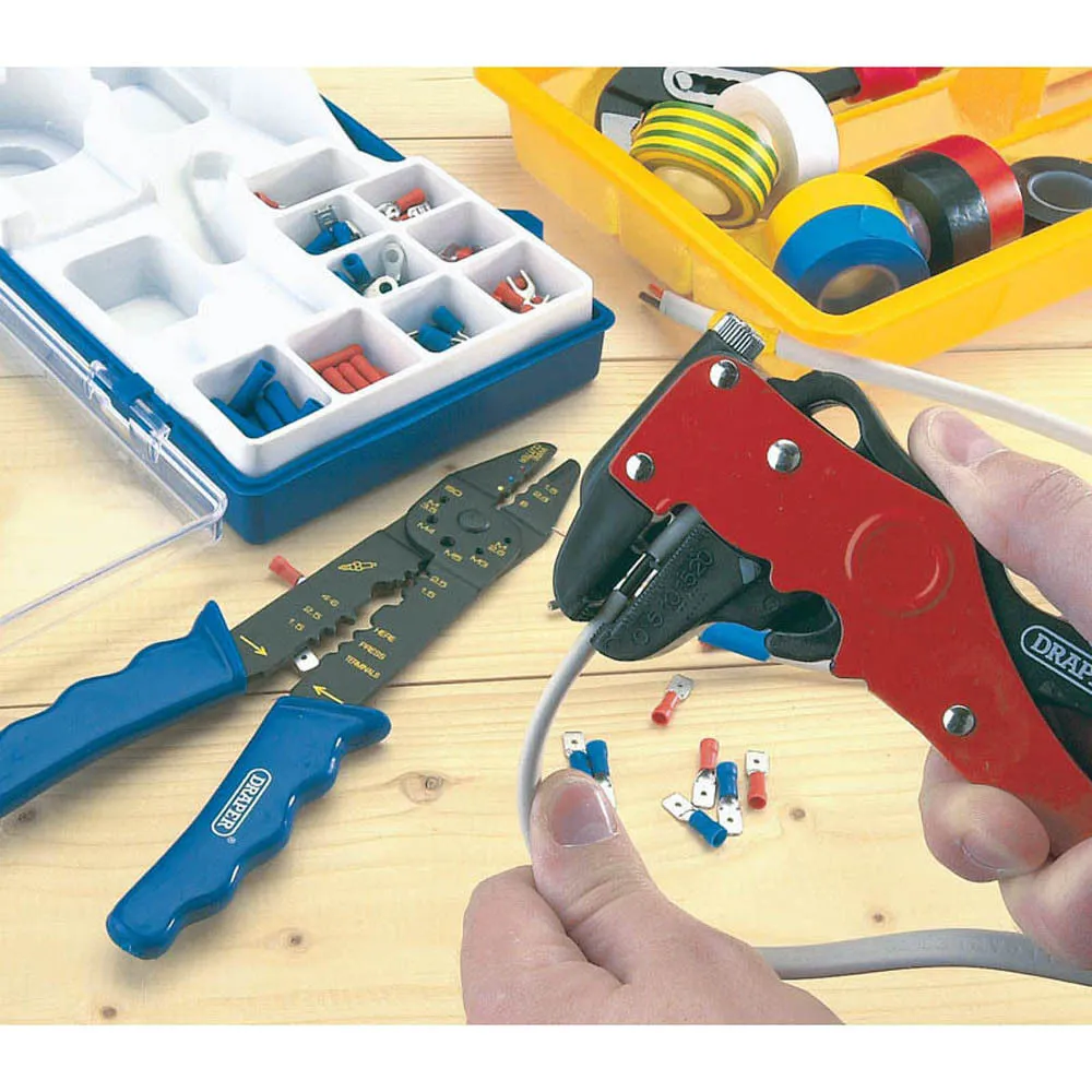 This Draper 6 Way Crimping and Wire Stripping Kit includes a 6 way crimping tool and wire stripper in a handy plastic storage case with approx. 100 insulated crimping terminals.