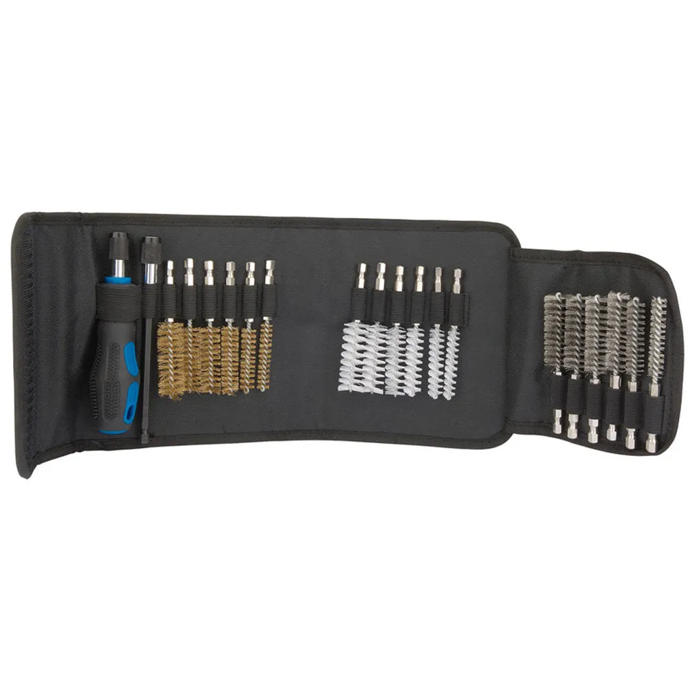 The Draper BBS is suitable for a variety of uses including internal/external thread cleaning, cleaning drilled holes and cleaning small bore holes etc. This set comprises of six nylon brushes, six stainless steel brushes, six brass brushes, soft grip magnetic handle and a 150mm magnetic extension.