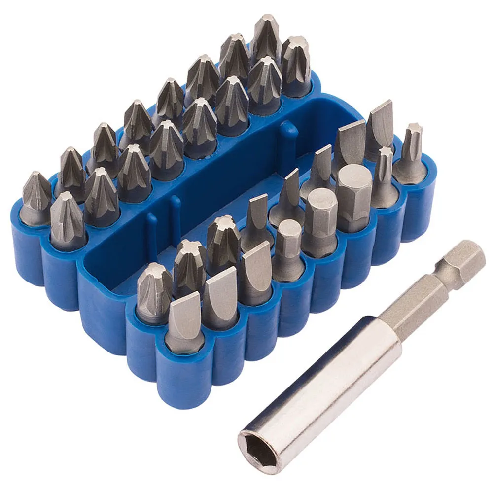 This 33 piece set from Draper has been manufactured from chrome vanadium steel, hardened and tempered with a shot blast finish. Supplied in a convenient storage case, which opens up for easy access to the bits. The magnetic bit holder is made from a zinc alloy steel with chrome plated finish.