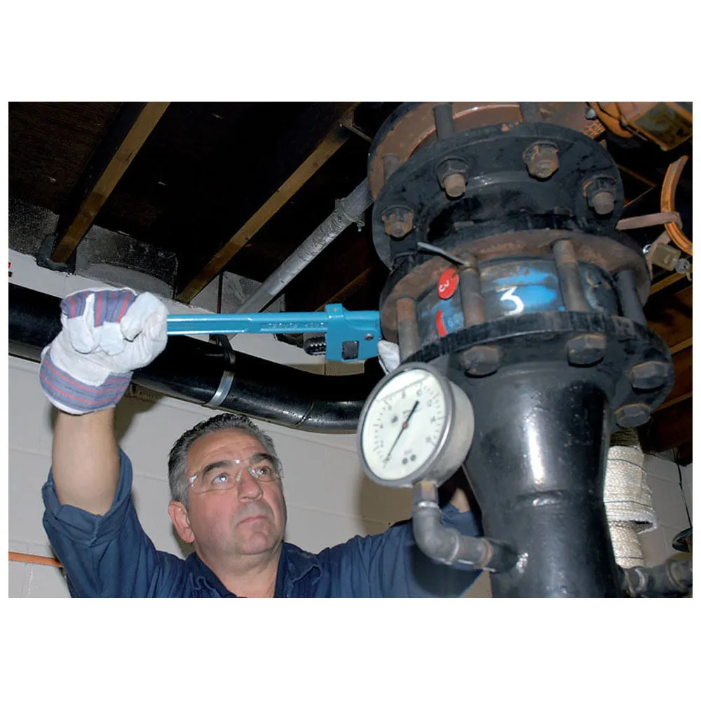 A Professional Quality pipe wrench, manufactured from tool steel, hardened and tempered. The spring-loaded induction hardened jaws have wide faces serrated in opposite direction to ensure a secure grip. It features a polished head with blue lacquered handle.