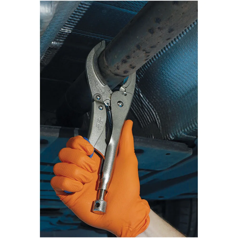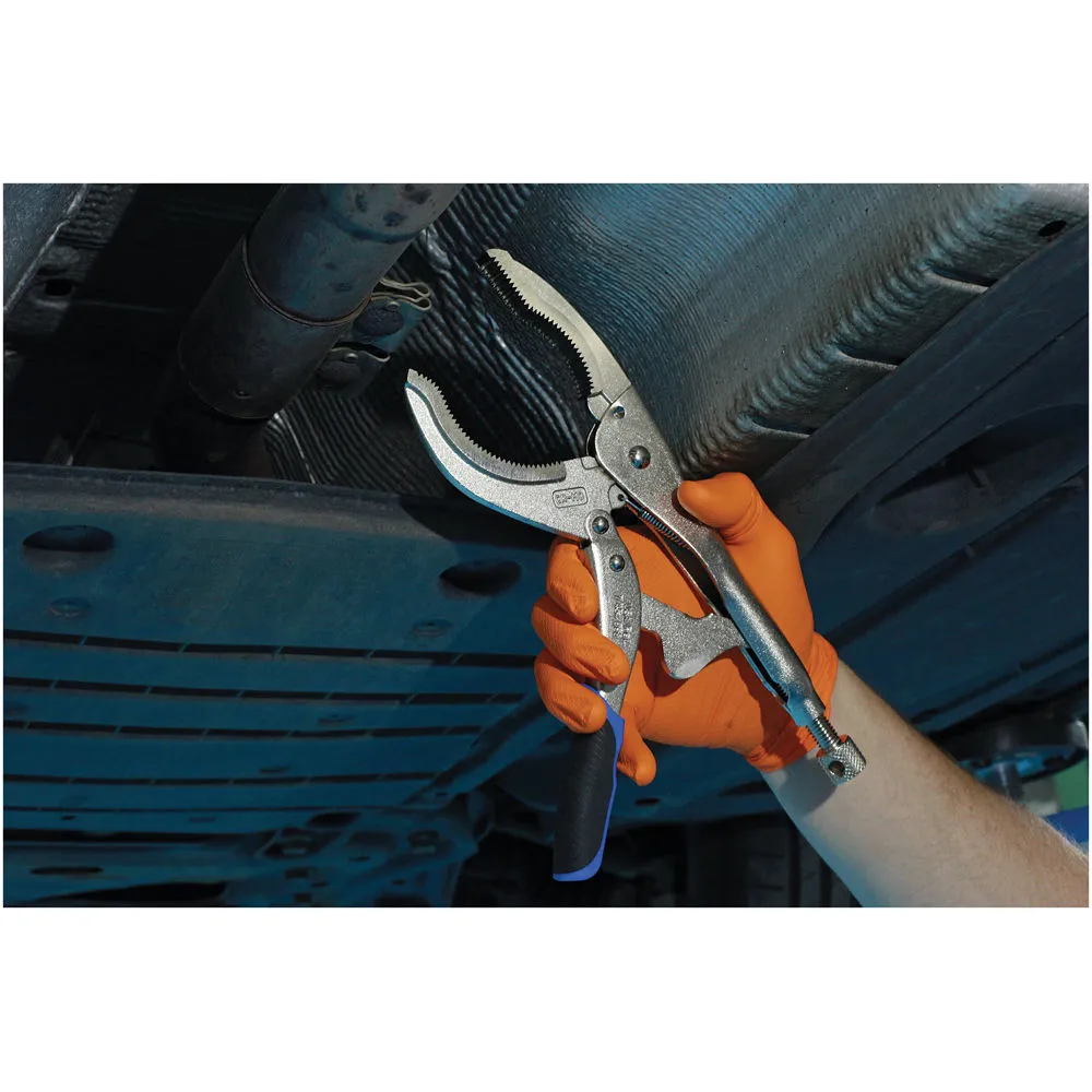 Heavy duty locking pliers with serrated gripping surfaces and a wide adjustable opening, they feature large curved shaped jaws suitable for gripping large objects such as piping. Ideal for use by plumbers, mechanics and welders.