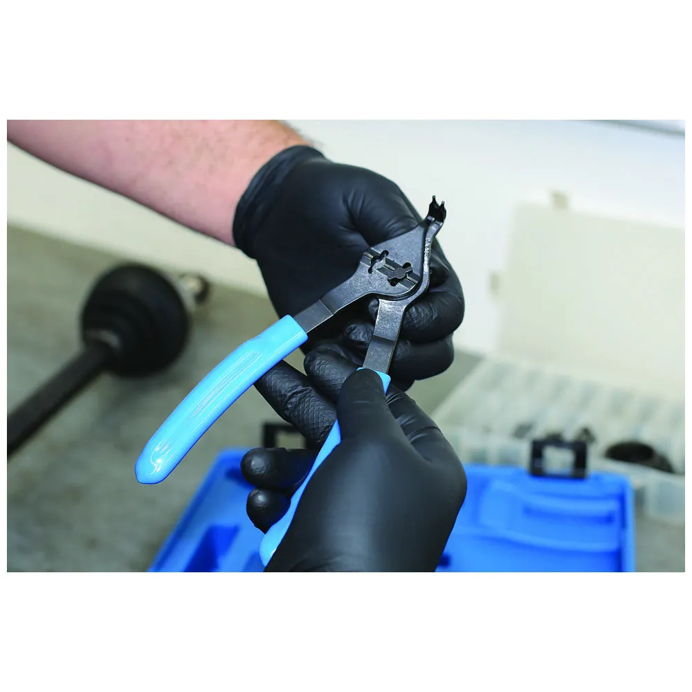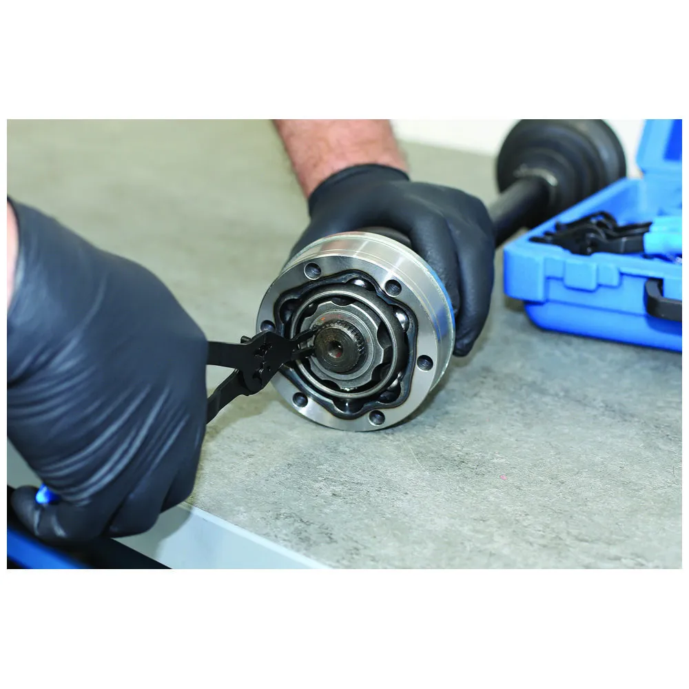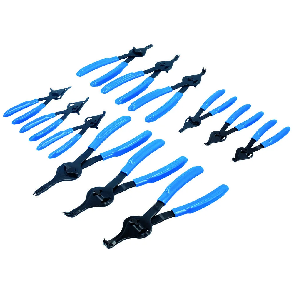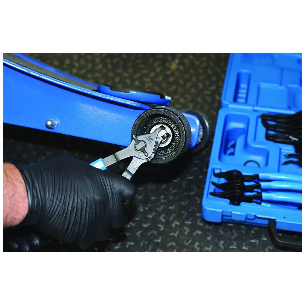 A comprehensive set of 12 snap ring pliers with quick change function allowing use on both internal and external circlips.
