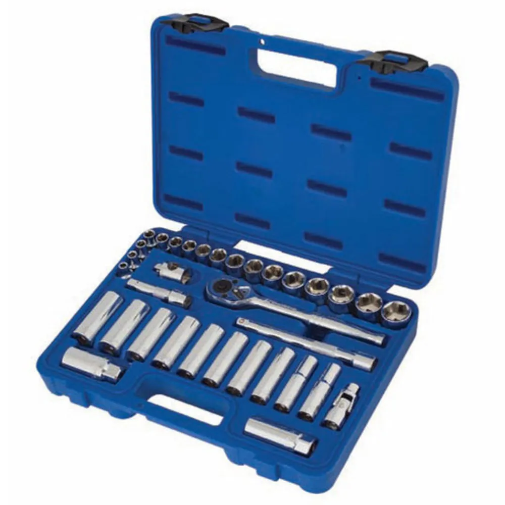 This socket set includes sockets in deep and standard format plus the usual array of socket accessories. Manufactured from chrome vanadium.