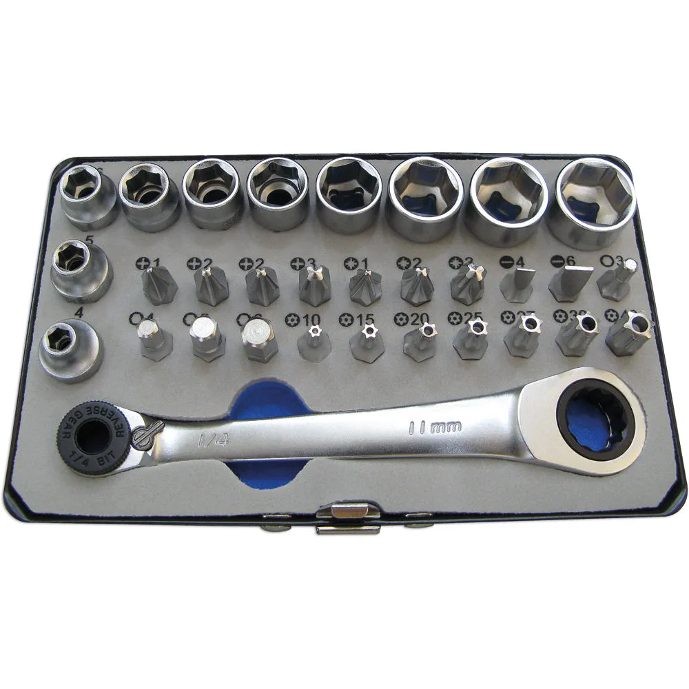 The Laser 6717 is a neat socket and bit set featuring a comprehensive selection of S2 bits and low profile go through chrome vanadium sockets. This is all driven by twin head ratchet driver and this set includes: