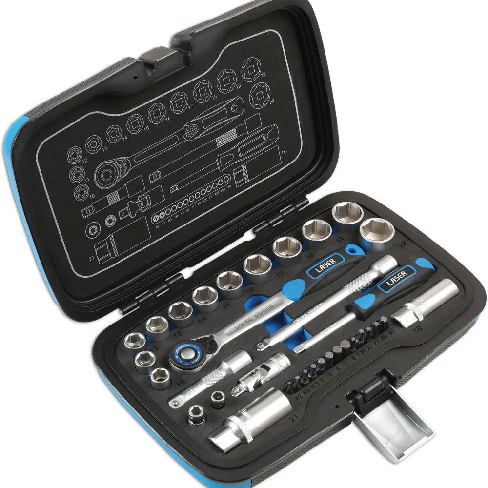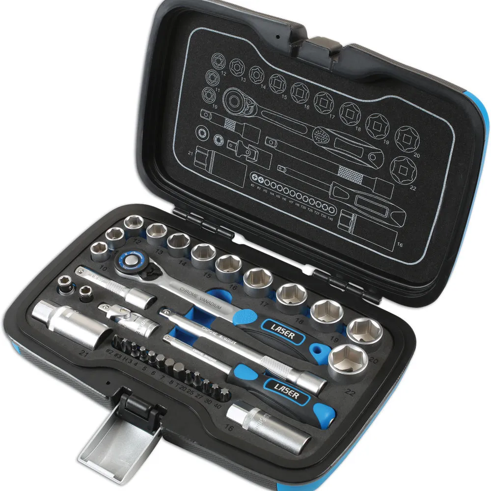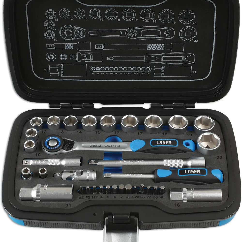 A 34 piece socket set in 3/8” and 1/4” drives manufactured from durable chrome vanadium. This set includes 12 x 6 point sockets, 3 x S2 bits, and switchable fine tooth ratchet with quick release.