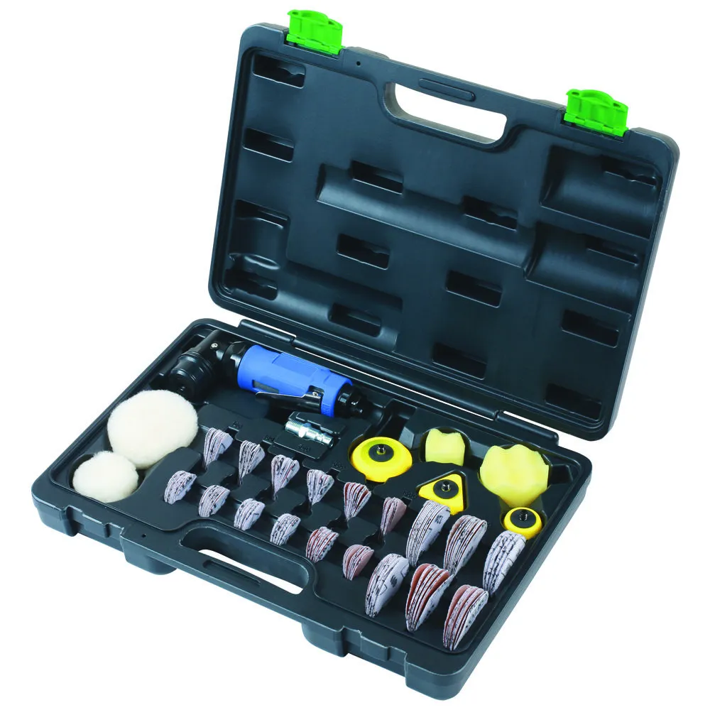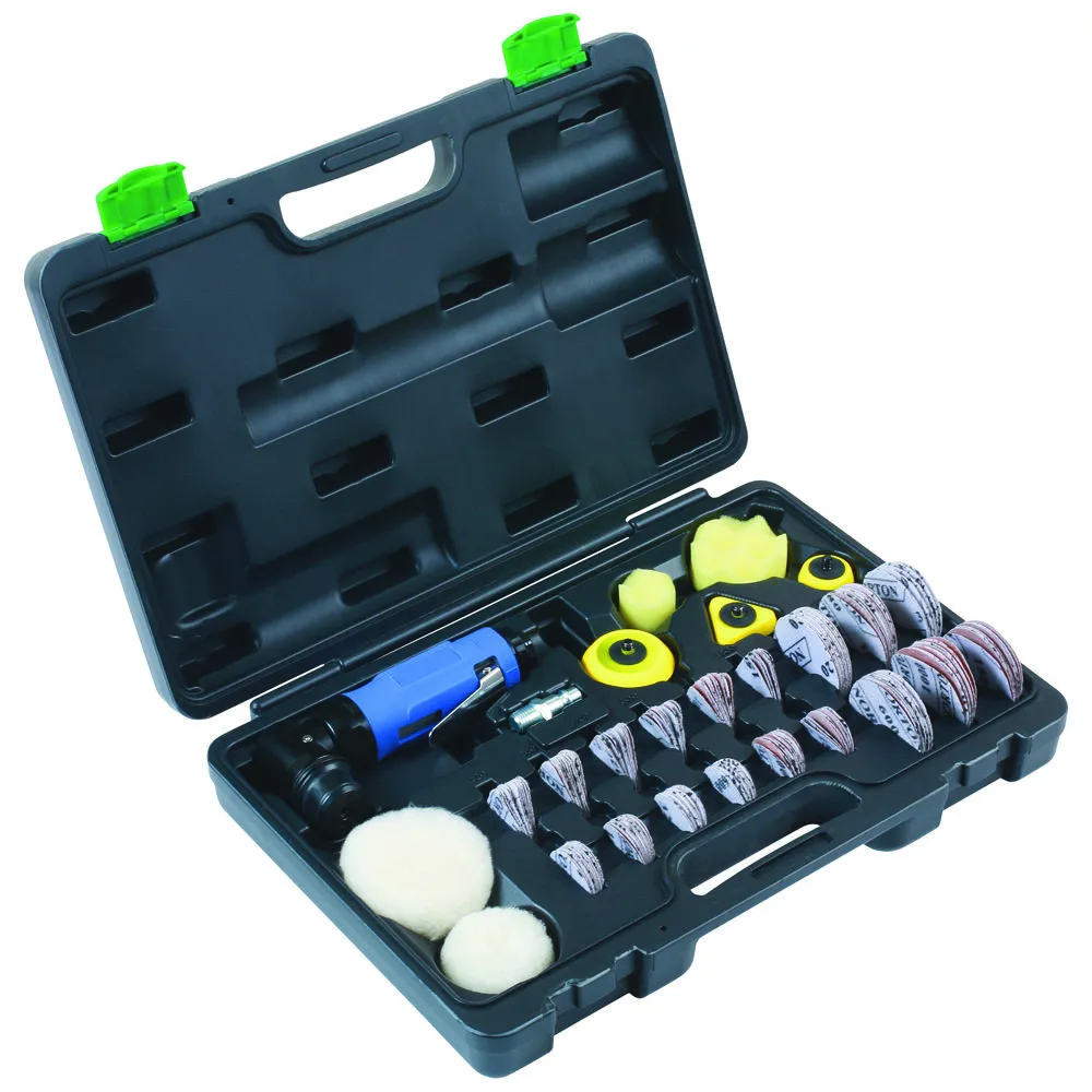 Ideal for spot refinishing and smart repair. Supplied with a selection of discs, pads and polishing pads. Uses workshop air.