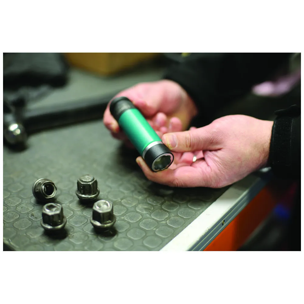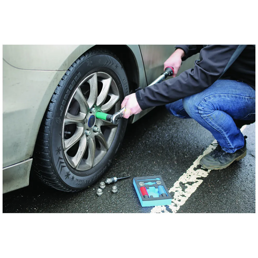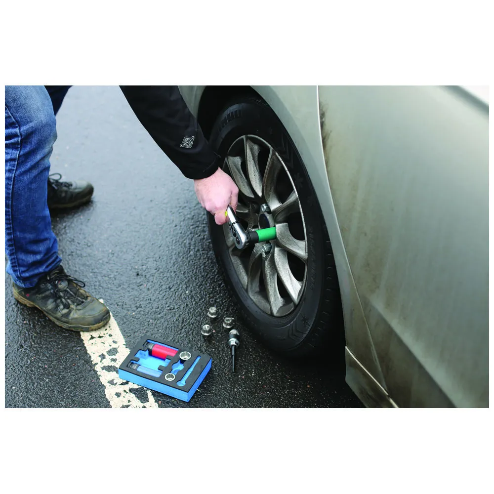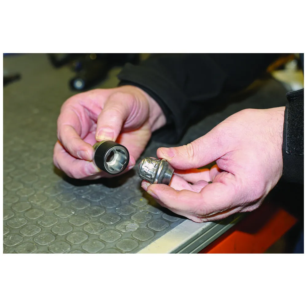 A 7 piece, 1/2″D wheel socket and bolt socket set specially designed for the removal of damaged wheel fixings.