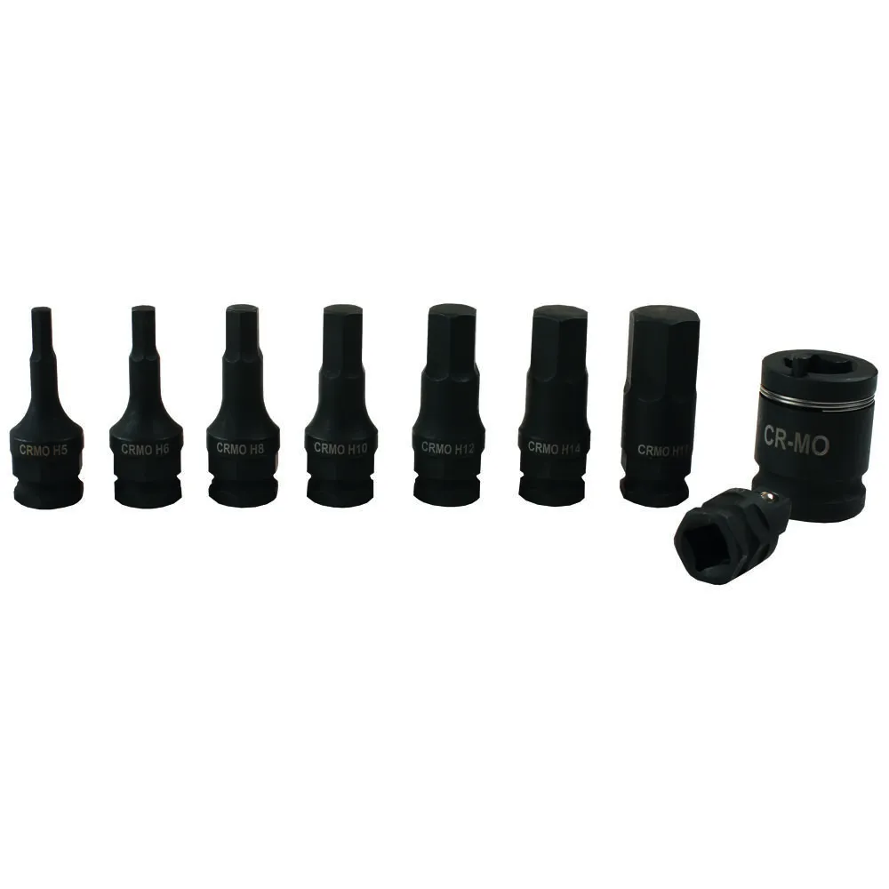 A 9 piece dual drive Hex impact bit set that allows the bit to be driven either via 1/2″D or 3/8”D power tools or wrenches. The 17mm Hex on the end of the bit also means that where space is tight the bits can also be used in a 17mm spanner or ratchet wrench.