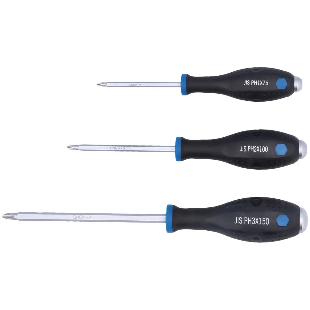 A set of three Pound Thru JIS screwdrivers. Laser Pound Thru JIS screwdrivers are specifically designed to fit JIS fixings, reducing cam out and the pound thru design allows the driver to be struck with a hammer to ensure the fixing breaks loose.