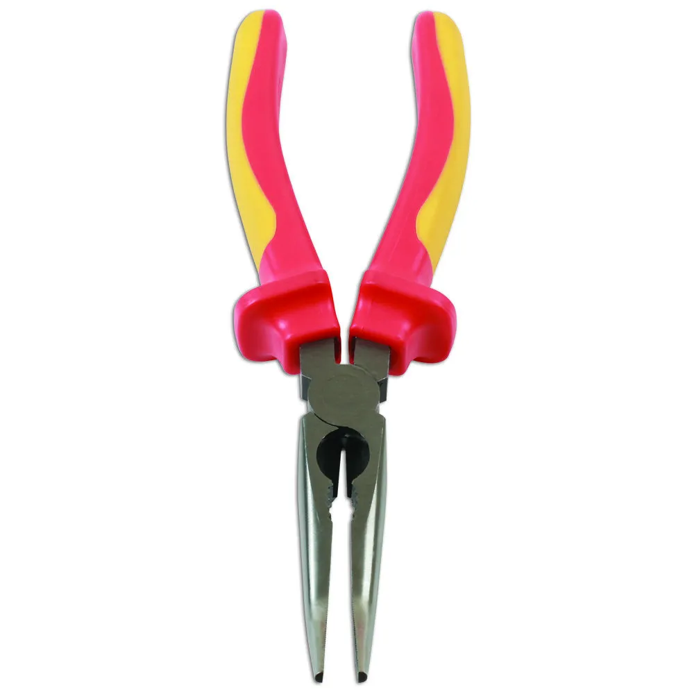 Insulated bent nose pliers, part of a wide range of insulated tools from Laser, manufactured from chrome vanadium with satin finish, with high voltage safety grip handles. VDE and IEC60900 certified.