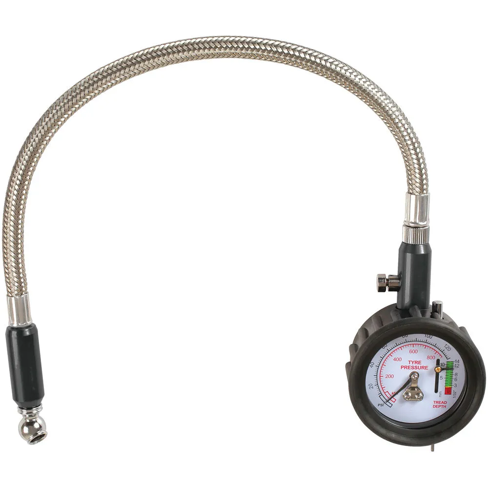 A handy 2 in 1 tyre pressure/tread gauge. Protective rubber body with long flexible reinforced hose. Suitable for Car and Commercial vehicles