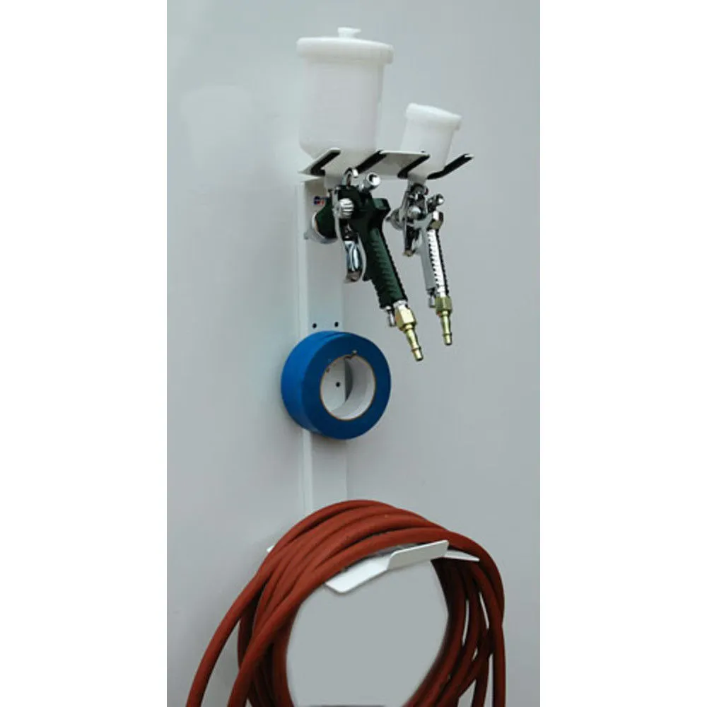 An essential addition to any spray booth, this useful hanger has enough space to hang two spray guns and features a tape hook and hose hook, to keep your valuable spray equipment out of the way and free from danger when not in use.