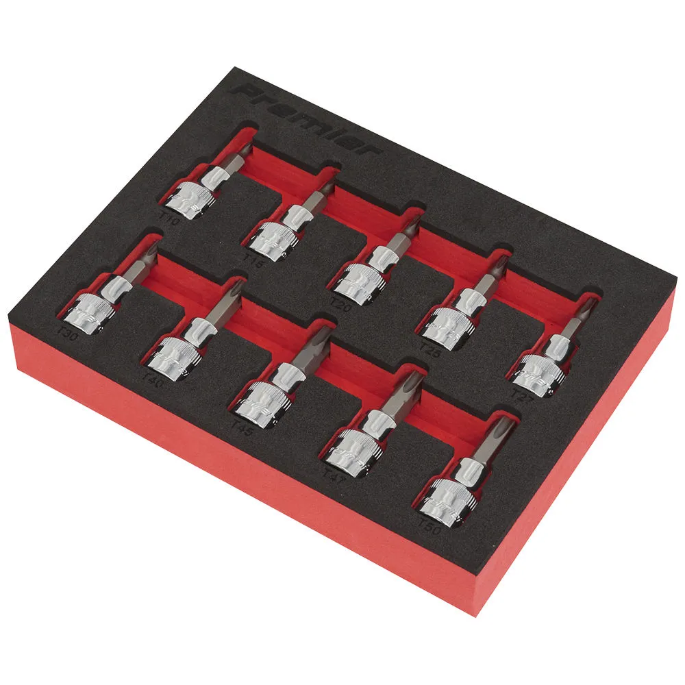 Contents: 3/8″Sq Drive 50mm TRX-Star* Socket Bits; T10, T15, T20, T25, T27, T30, T40, T45, T47, T50