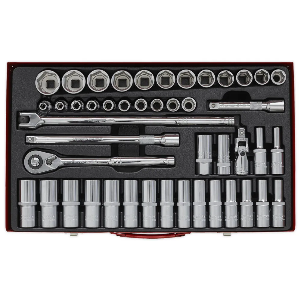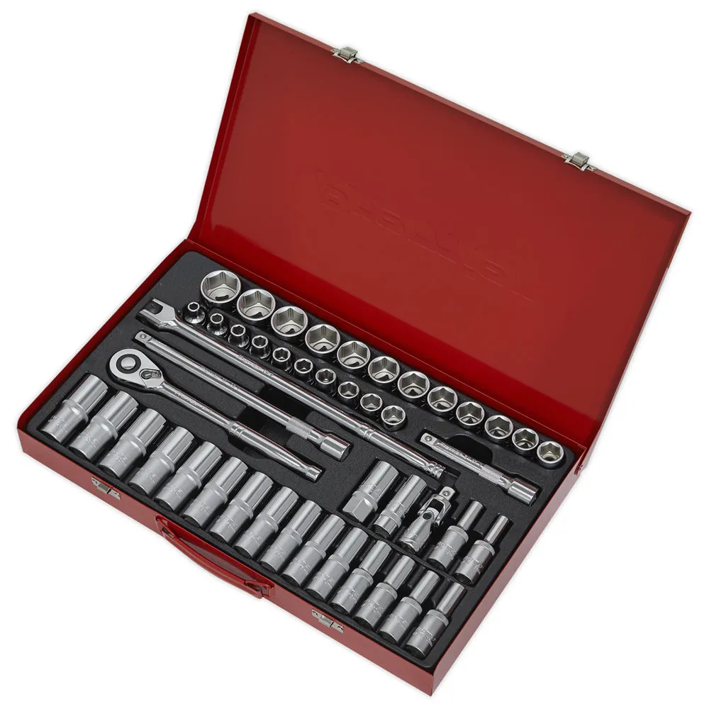 One of a comprehensive range of Premier Hand Tools, suitable for daily professional use. This deluxe professional socket set with heat treated Chrome Vanadium steel WallDrive® sockets. The set comes in a dual satin/chrome finish. It features a flip reverse gear-to-gear ratchet with quick socket release. Supplied in metal storage case.
