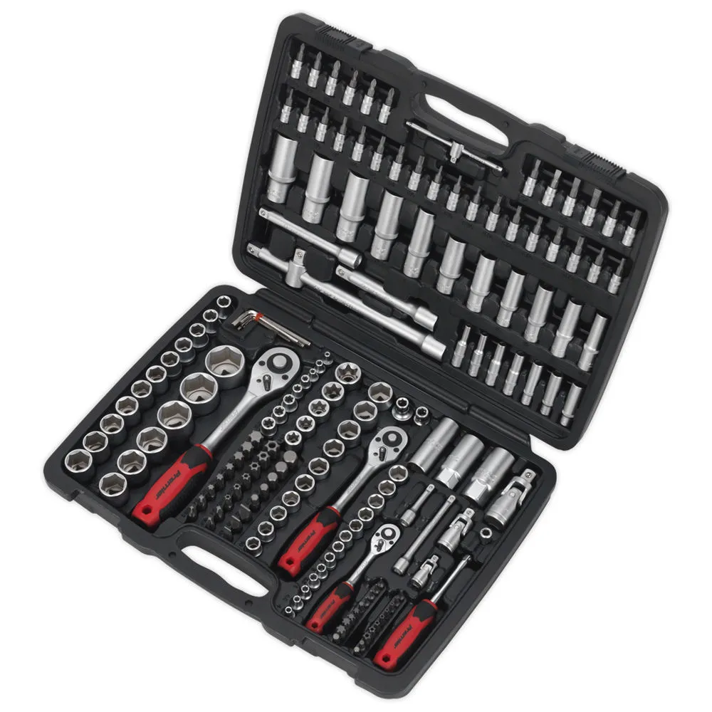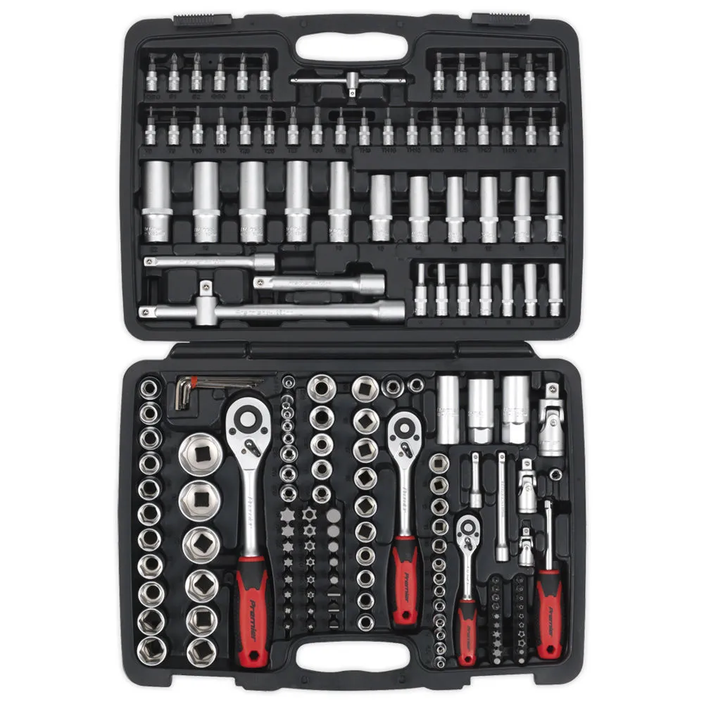 Deluxe professional socket set with hardened and heat treated Chrome Vanadium steel sockets. Fully polished satin finish. Covers sizes from 4 to 32mm. Includes comfort grip ratchet wrenches, spark plug sockets, extension bars, female TRX-Star* sockets, socket bits, hex keys, bits, spinner handle and accessories. Supplied in tough, durable carry-case.
