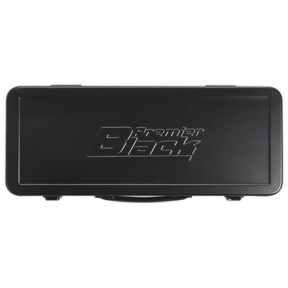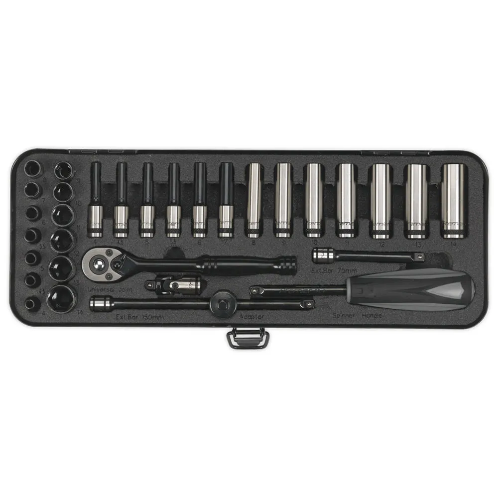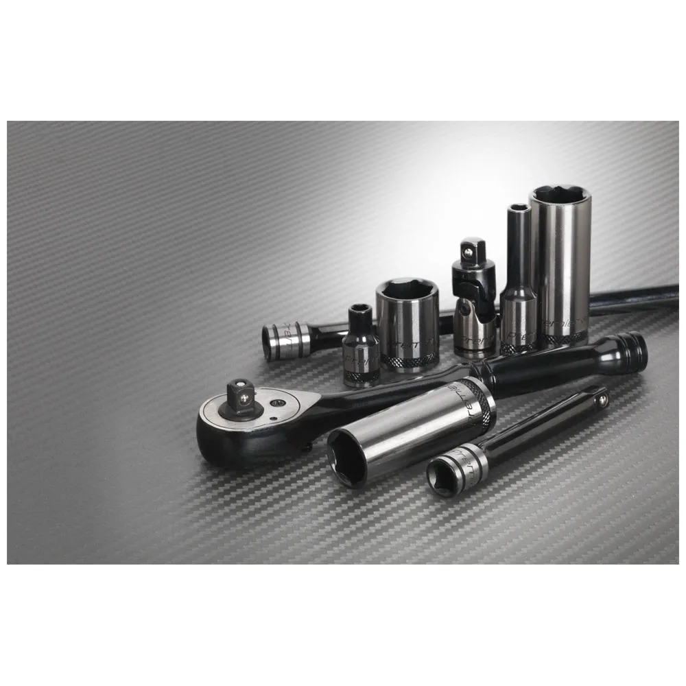 Professional socket set with heat treated Chrome Vanadium steel sockets and accessories. Fully polished black chrome finish with machined and lacquered surfaces. Standard and deep sockets cover sizes from 4 to 14mm. Features 72-tooth flip reverse ratchet wrench with push-button quick release, extension bars, universal joint and T-bar adaptor. Includes contents map displayed inside the lid. Supplied in metal storage case.