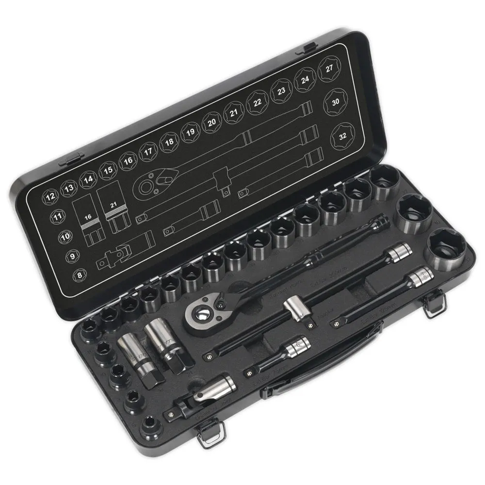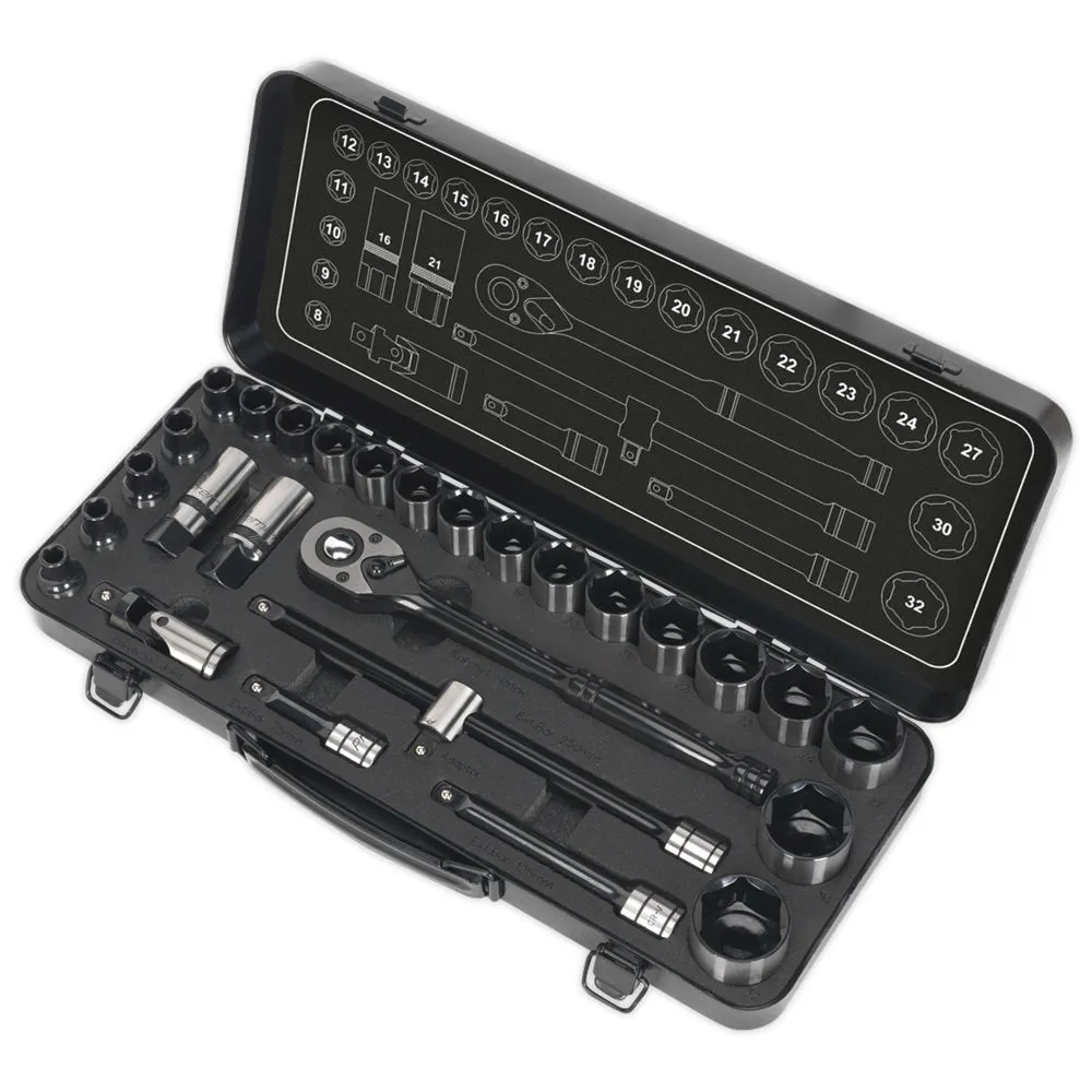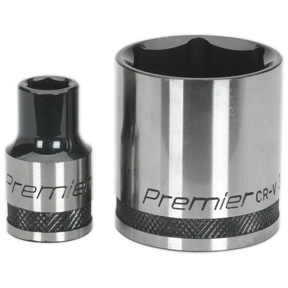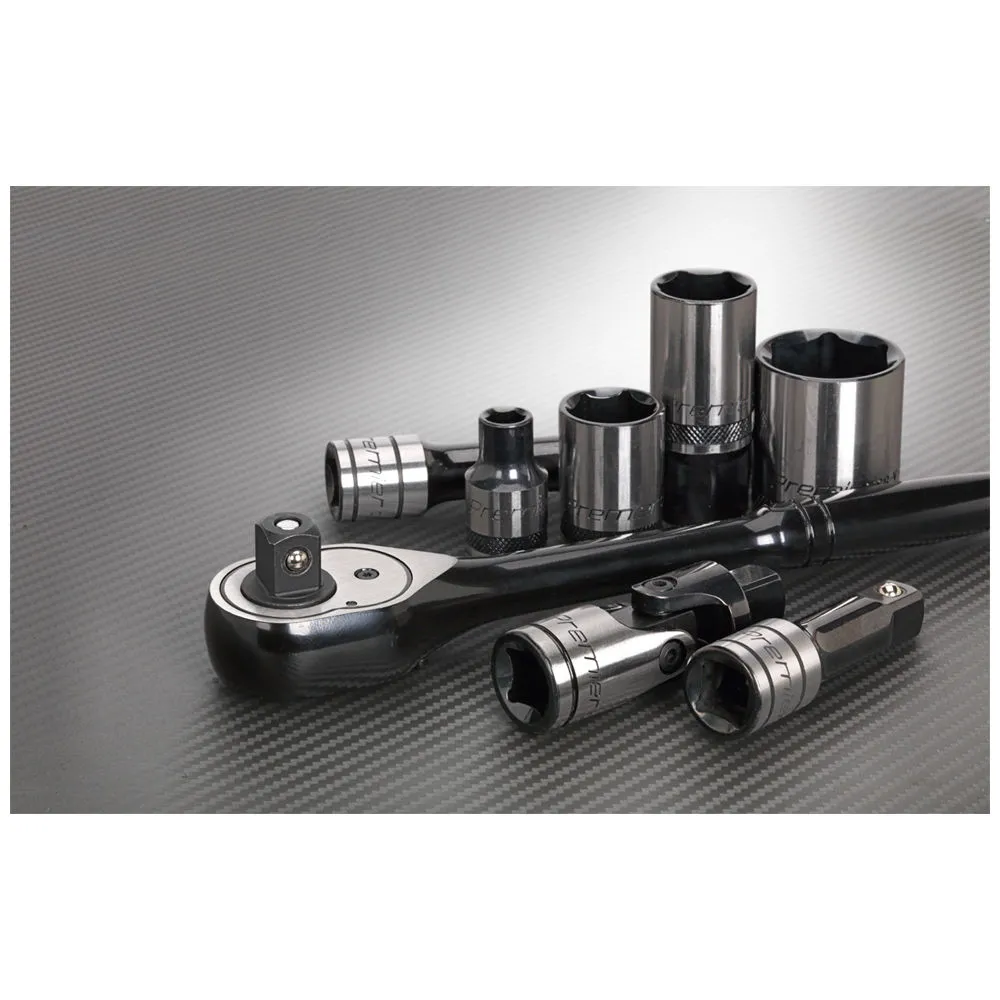This socket set is one of a comprehensive range of Premier Hand Tools, suitable for daily professional use. It is a professional socket set with heat treated Chrome Vanadium steel sockets and accessories. Each piece comes with a fully polished black chrome finish with machined and lacquered surfaces.