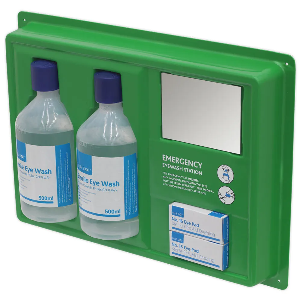 Comprises sterile eye and wound wash for cleaning and eye pads for dressing. Features a shatterproof mirror. Suitable for garages, workshop and any other environment with potential eye/wound related hazards.