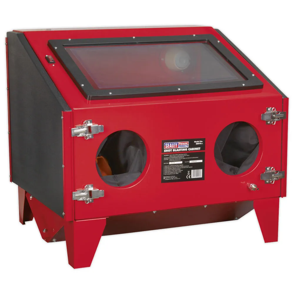 Heavy gauntlets provide hand protection and cabinet is supplied with sand blasting gun with three spare ceramic nozzles.