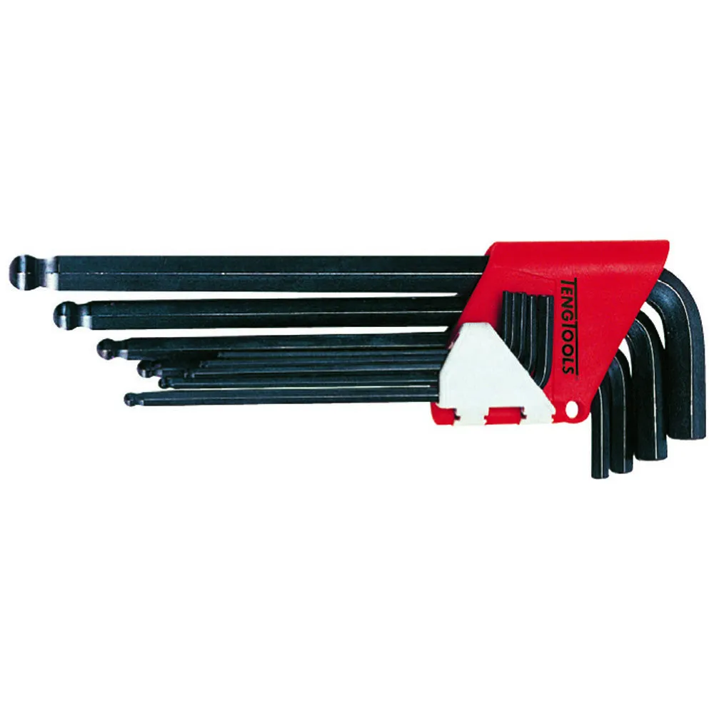 Set of 9 metric chrome vanadium steel hex keys. With ball point head on the long key end for 30° access. Supplied in folding plastic holder.