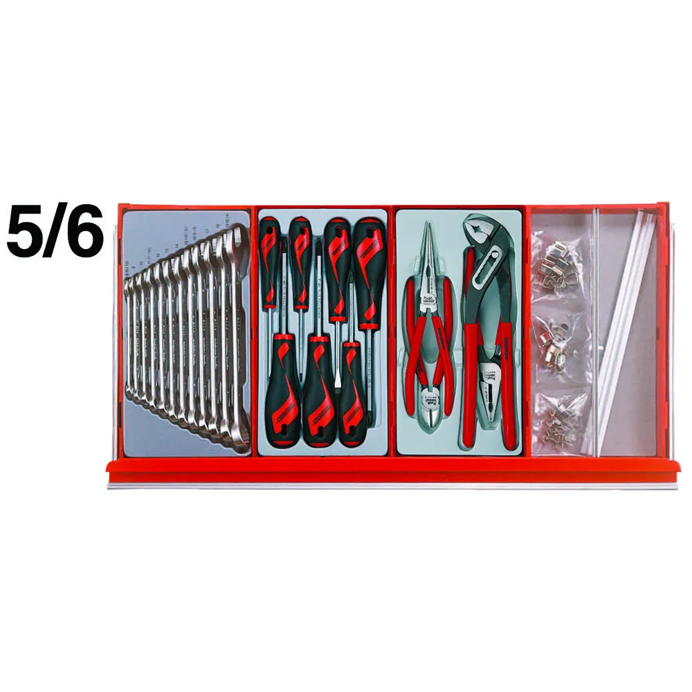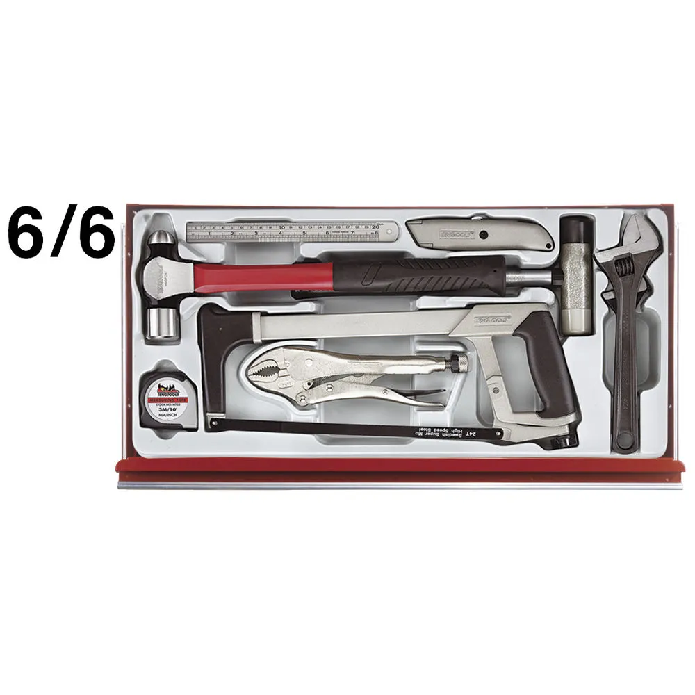 140 piece service kit containing 1/4”, 3/8” and 1/2” socketry, spanners, pliers, screwdrivers, also including the TTPS09 tray set with adjustable wrenches, power grip pliers, utility knife, hack saw, hammers, a measuring tape and a steel rule. Supplied with the 8 series TC806NF ball bearing slide top box.