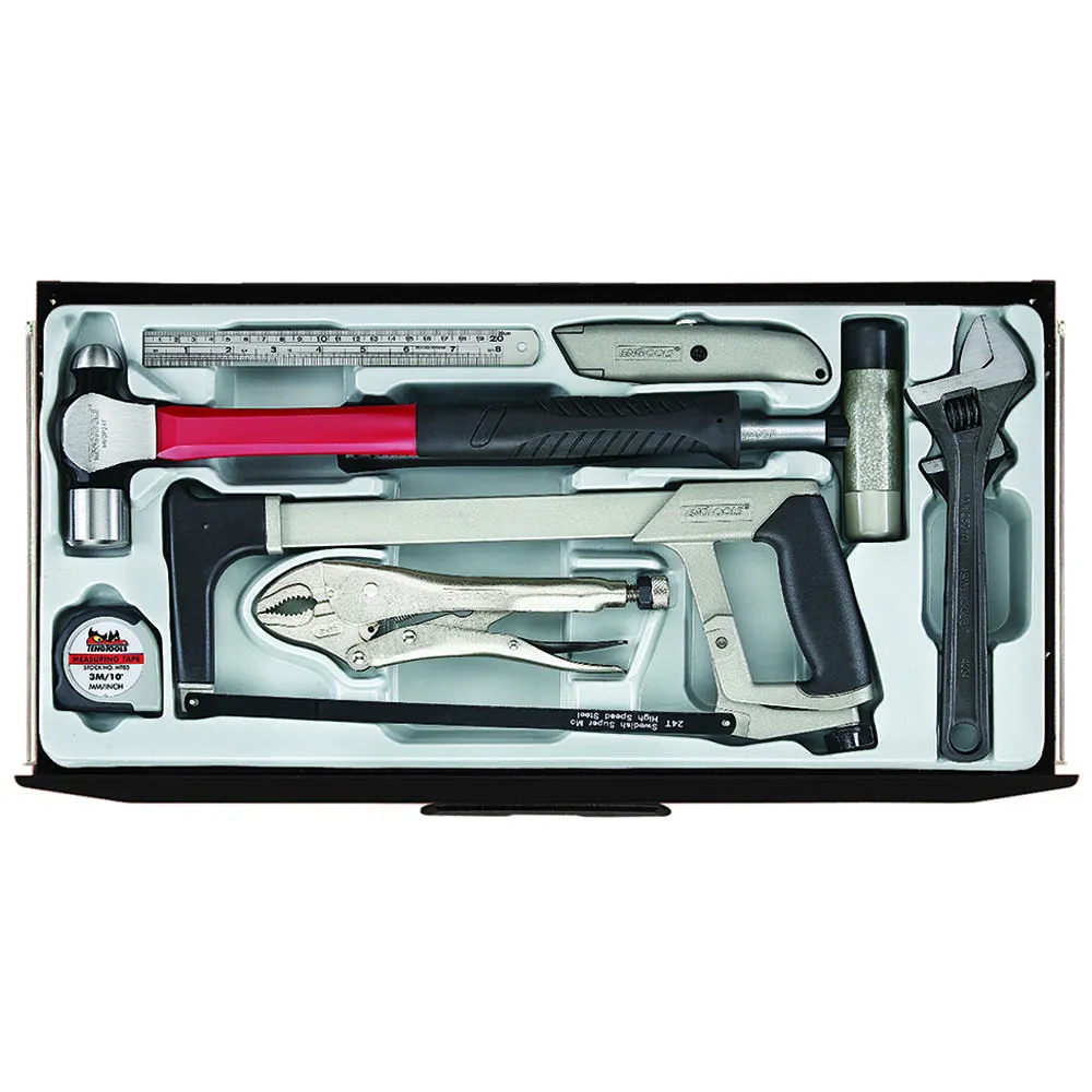 This 140 piece service kit containing 1/4”, 3/8” and 1/2” socketry, spanners, pliers, screwdrivers, also including the TTPS09 tray set with adjustable wrenches, power grip pliers, utility knife, hack saw, hammers, a measuring tape and a steel rule. Supplied with the 8 series TC806NF ball bearing slide top box