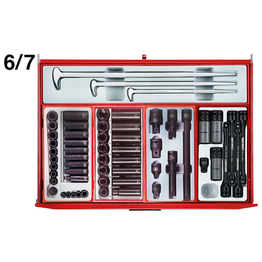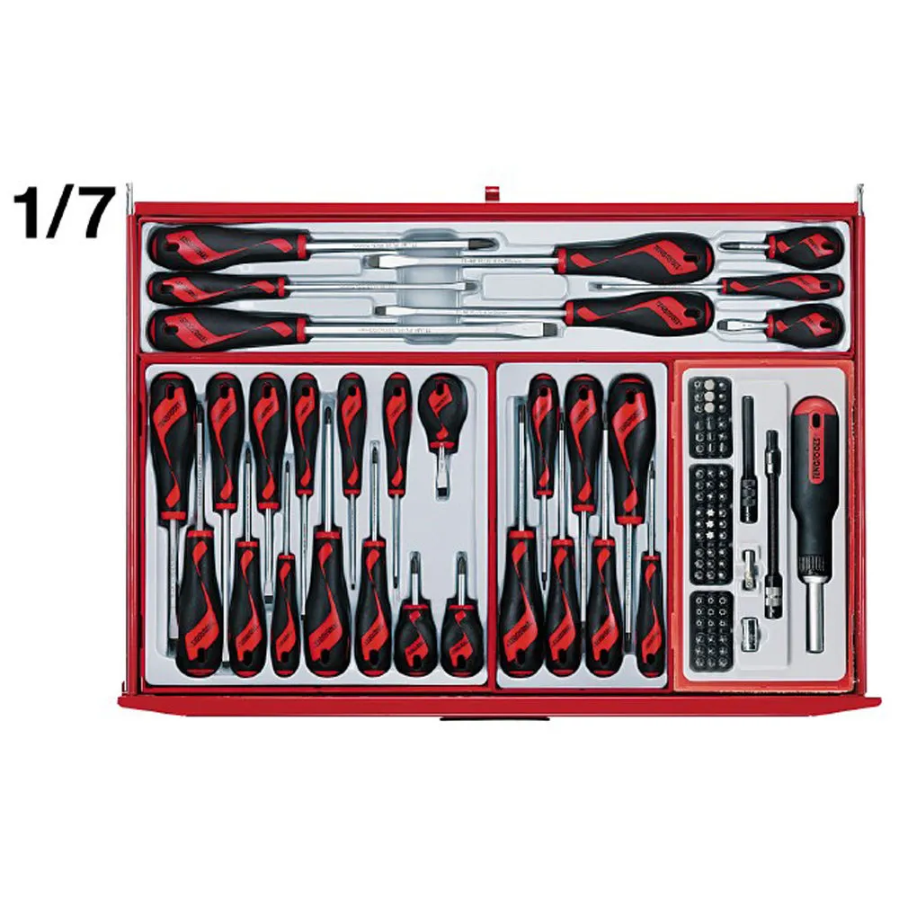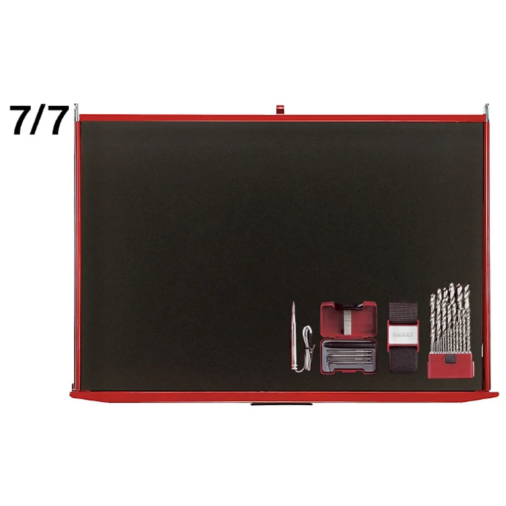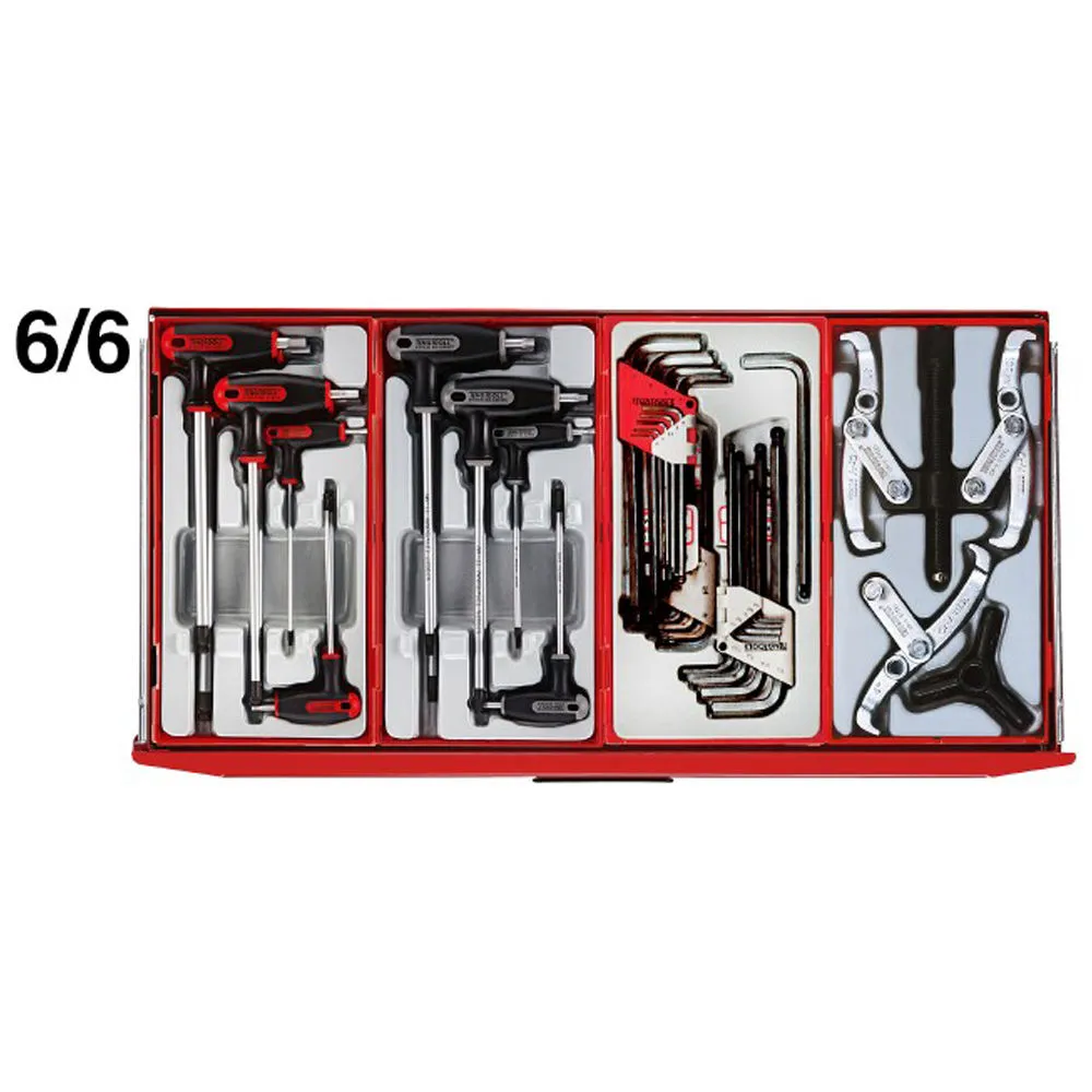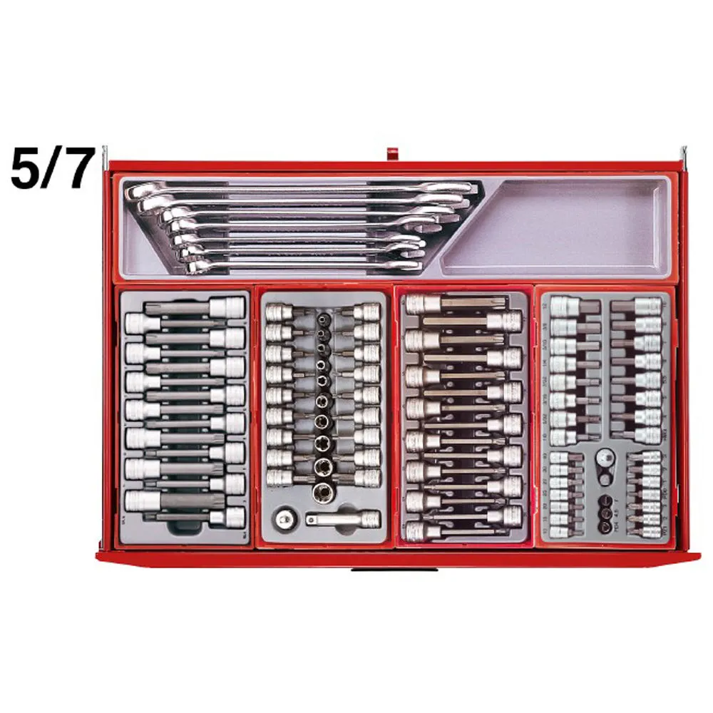 A comprehensive 1,055 piece tool kit covering just about every type of regularly used technician’s tools. Built up using the unique Teng Tools TC tray system and supplied in a TC806NF/TC803N/TCW807N 8 series ball bearing top box/middle box/roller cabinet combination. TCF01 brackets are included for securing the middle box to the roller cabinet. The TCW-SP01 side plate is also included for hanging additional tools on the outside using Teng Tools hooks.