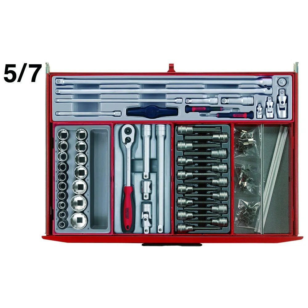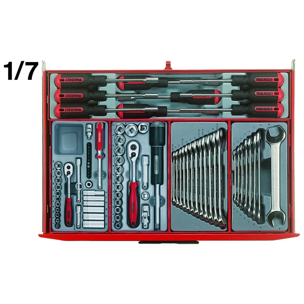 A 491 piece general tool kit completely built up using the unique Teng Tools TC tray system, supplied in a TCW807N, 8 series ball bearing roller cabinet.