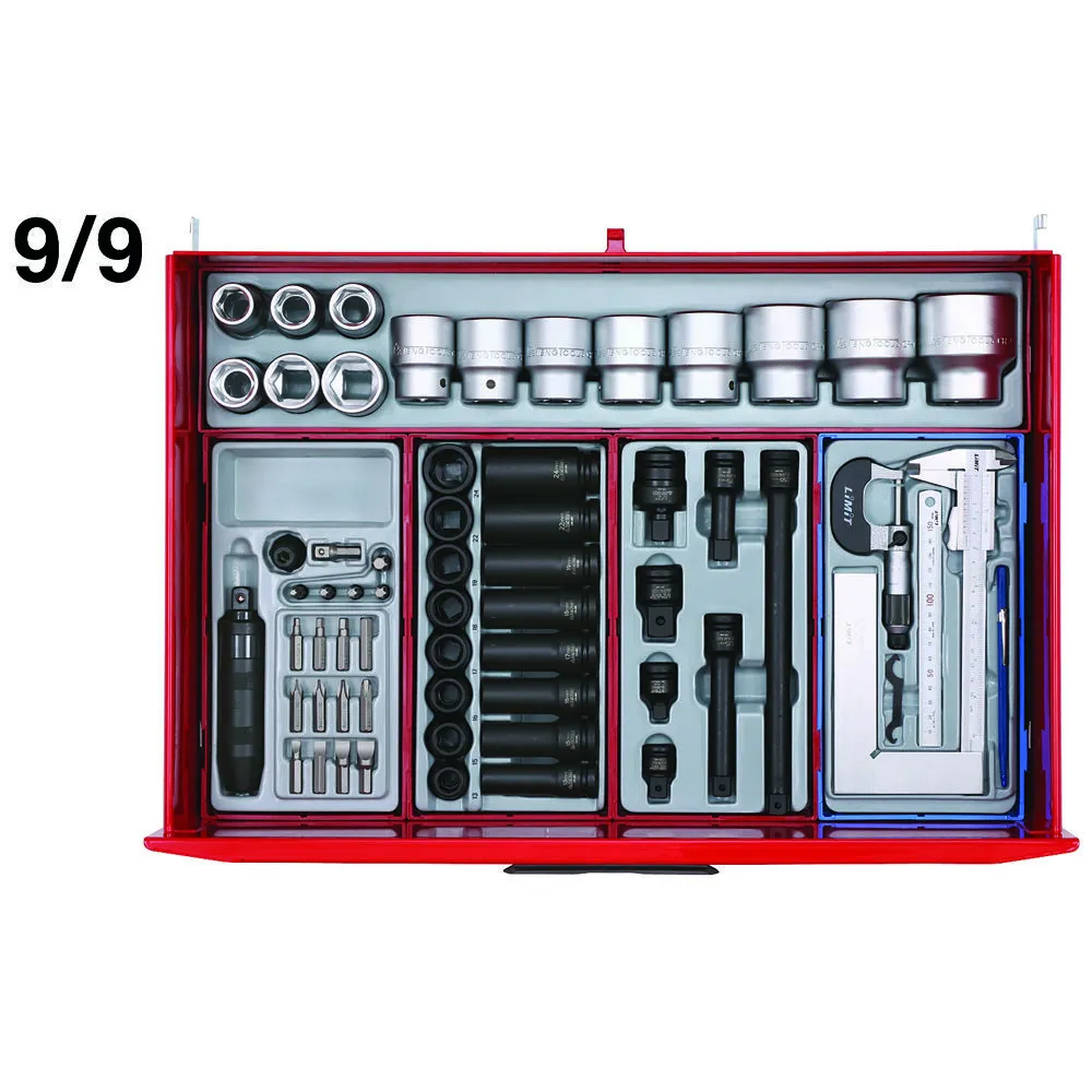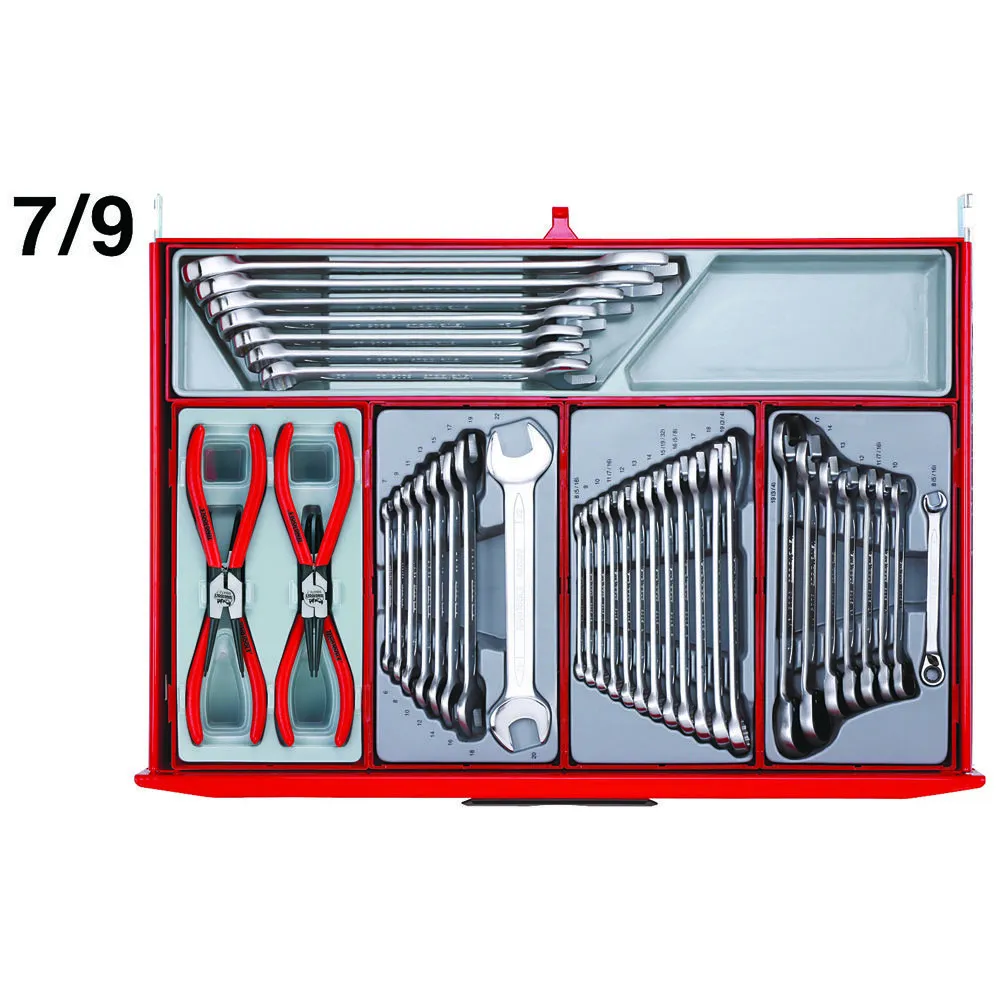 A 569 piece tool kit containing tools for the industrial sector, built up using the unique Teng Tools TC tray system. Supplied in the TCW809N 8 series 9 drawer roller cabinet with a wooden top plate.