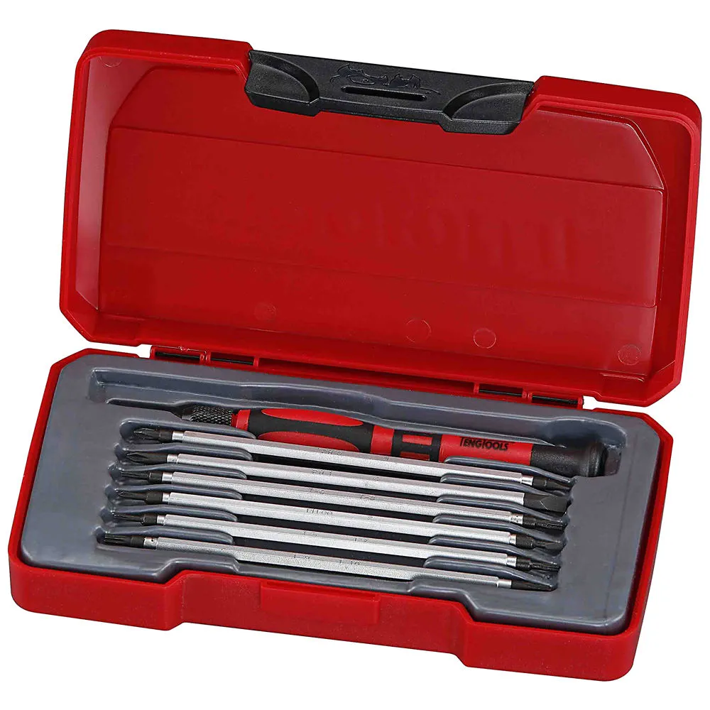 8 piece Mini Screwdriver set. Consisting of 7 double ended blades with one tip in each end and one universal screwdriver handle. Supplied in a handy storage box with click lock. All Teng Tools screwdrivers are designed to have a hole in the handle which can also be used for securing the tool with a fall protection wire if needed.