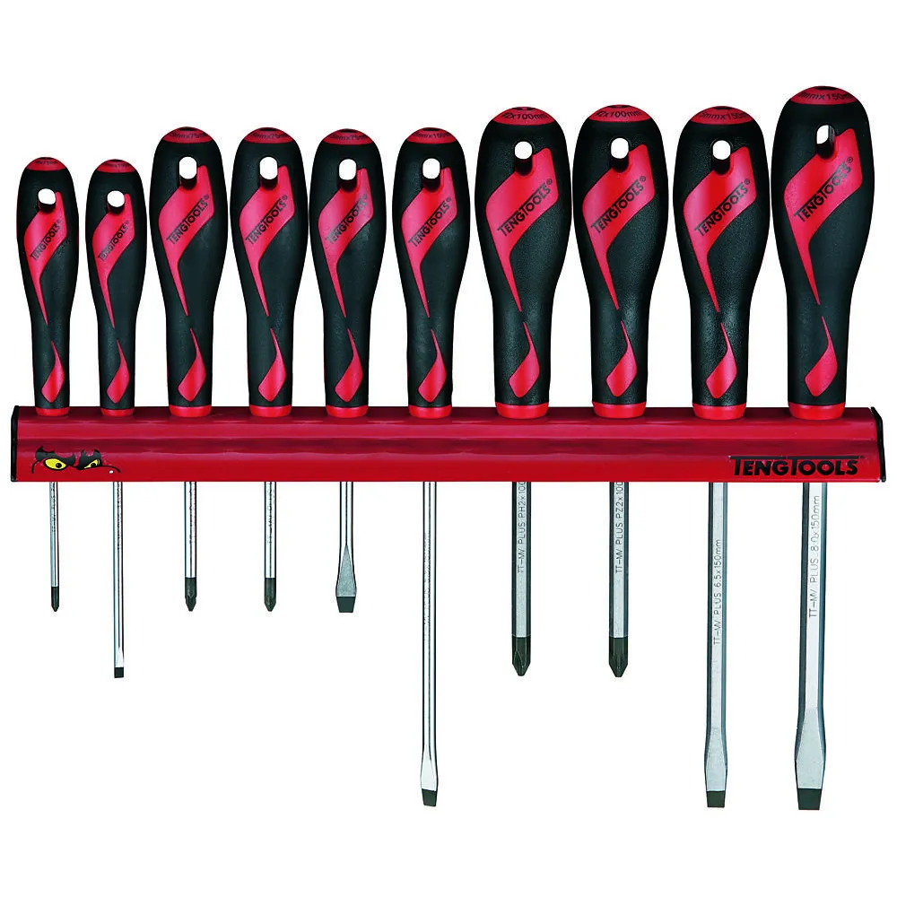 10 piece screwdriver set. The screwdrivers feature bi-material TPR grips for added comfort and grip. The set is supplied complete with a wall rack for fixing to the wall or a work bench.