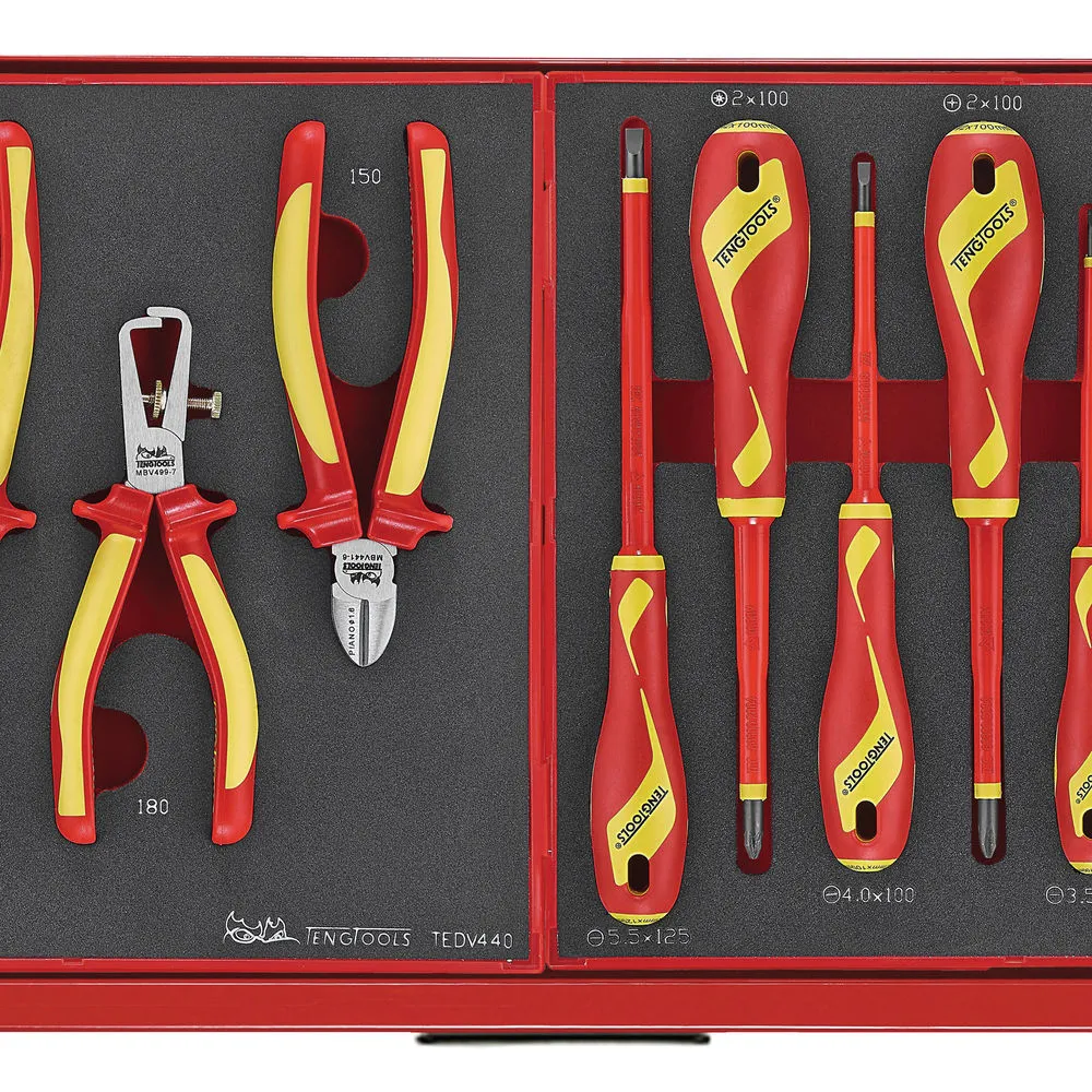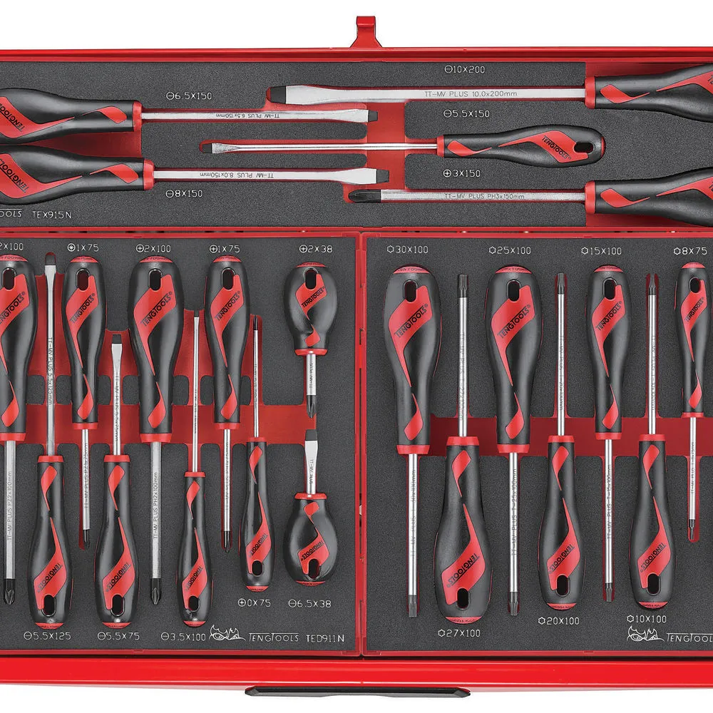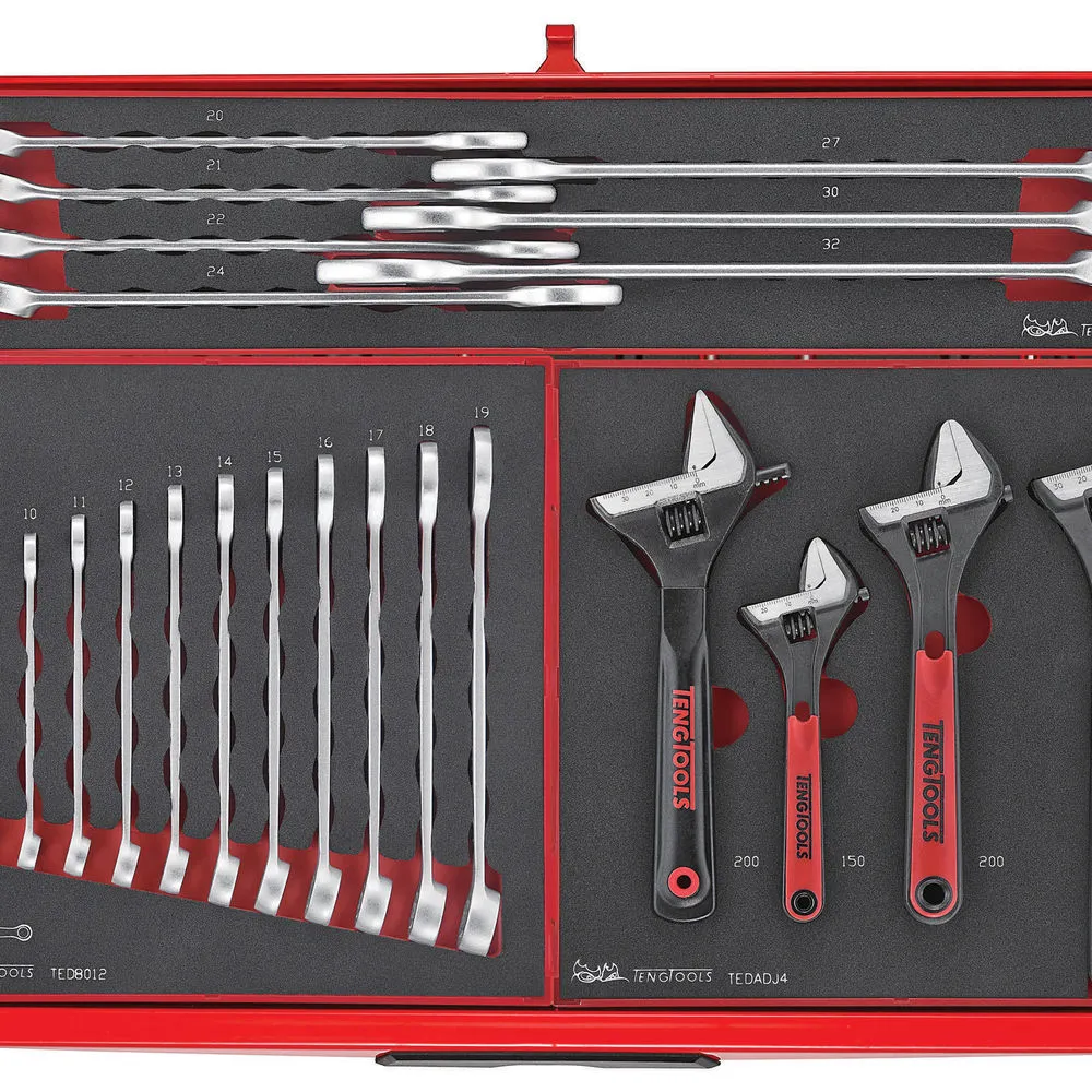 The tool kit is supplied in the Teng Tools TC806NF 6 drawer top box and TCW807N 7 drawer roller cabinet, all with ball bearing slides. The comprehensive selection of tools only uses 6 of the available 13 drawers ensuring that space is still available to add to the kit if needed.