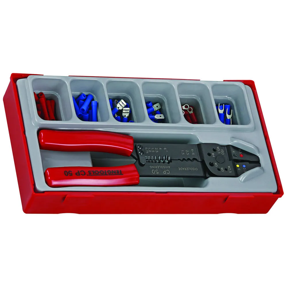 Set consisting of crimping tool CP50 with slots for crimping red, blue and yellow terminals and cutters for bolts and wire. Also included in the assortment are 120 terminals of varying types coloured red and blue. Supplied in the unique Teng Tools TC tray with removable lid and dove tail joints for use on it’s own or as part of the Teng Tools TC control system.