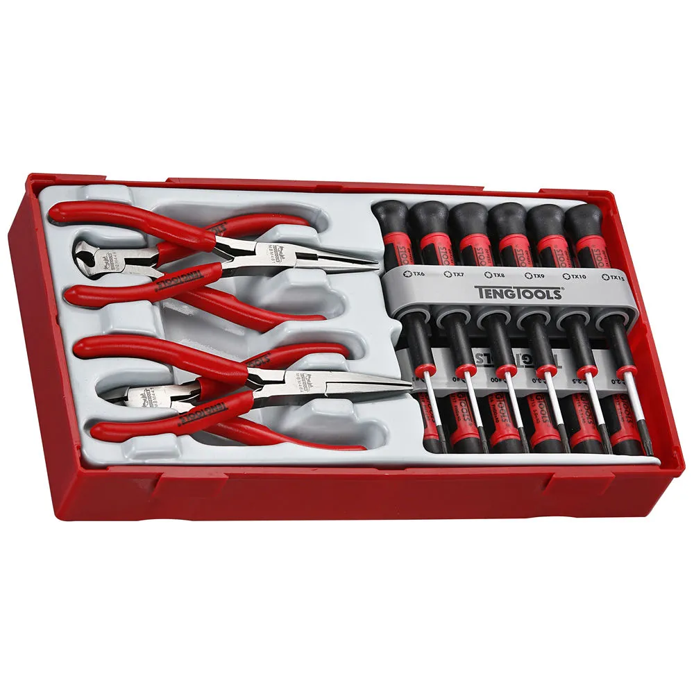 Set containing 12 mini screwdrivers and 4 mini pliers. Supplied in the unique Teng Tools TC tray with removable lid and dove tail joints for use on it’s own or as part of the Teng Tools TC control system.