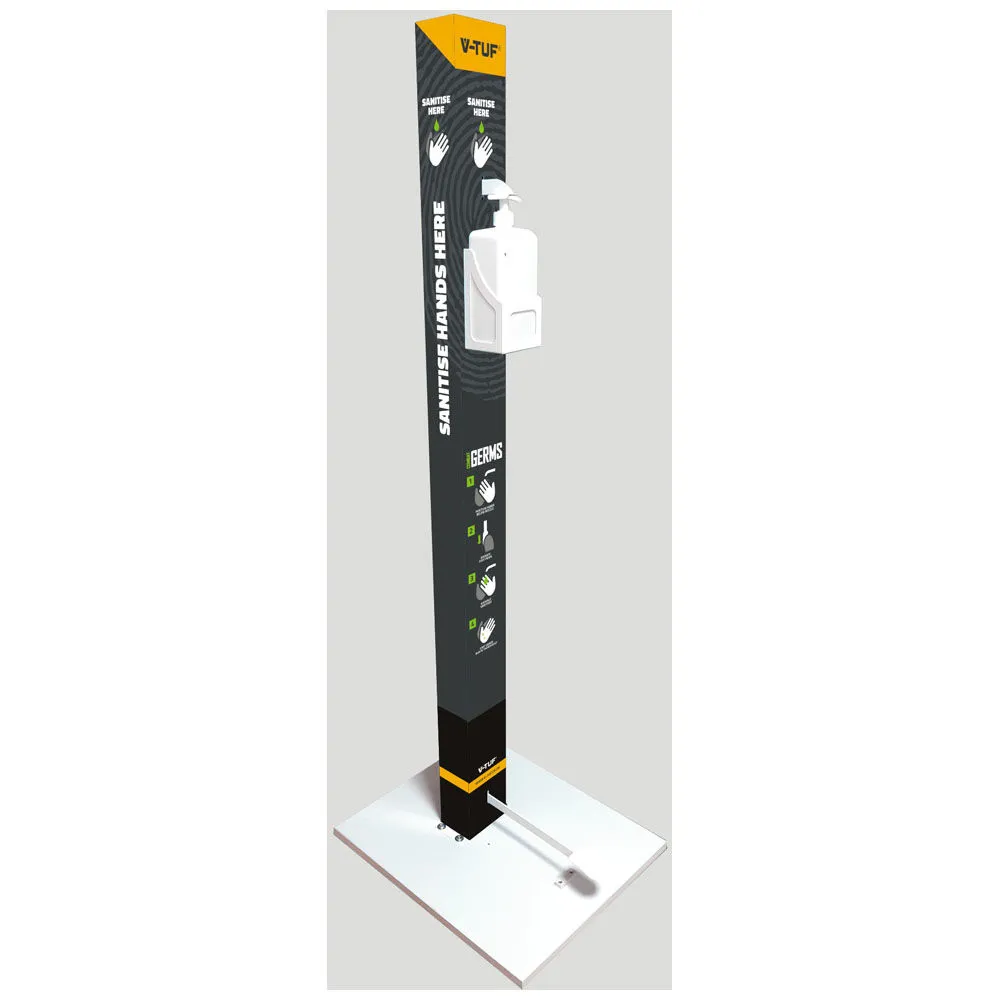 The V-TUF Hand Sanitiser Station is completely free standing so that it can be placed anywhere without the need of installation. One of the most common causes for the spread of germs and virus is through hand contact. The V-TUF Hand Sanitiser Station uses a very simple and robust foot pump method, thus eliminating cross contamination from handling bottles and hand sanitiser containers among a flow of public.
