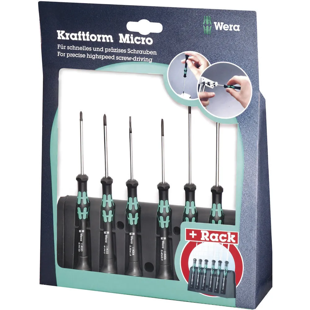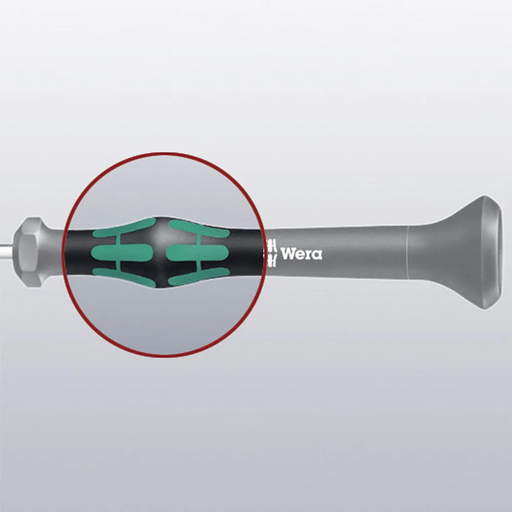 Kraftform Plus professional precision micro screwdriver set manufactured using high grade steel. The handles feature a convex/concave cap for an easy turning action and comfortable hand rest. The integral hex-shoulder prevents tool roll-off. Ideal for electronic and light engineering.