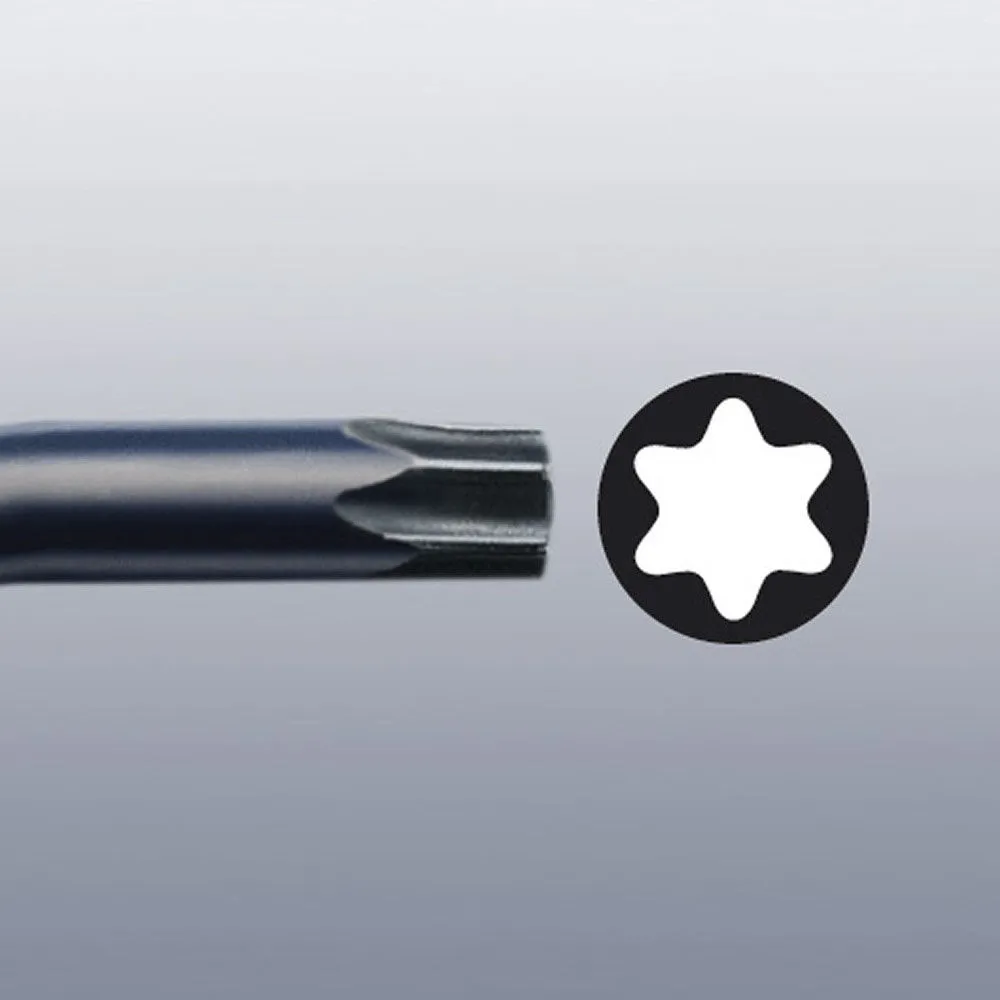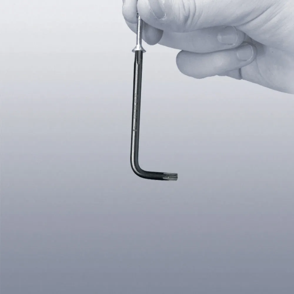 High grade steel Torx security key set with Torx Ball-End that enables access to the screw in confined spaces. Made from round bar with machined ends for a precision fit and extra strength. The thermoplastic sleeve makes these keys very comfortable during use, especially over long periods and in cold conditions. High corrosion protection due to the BlackLaser surface treatment. The practical rubber clip keep the keys secure and also features a magnetiser/demagnetiser. Multi-coloured sleeves allow quick and easy selection of the required size.