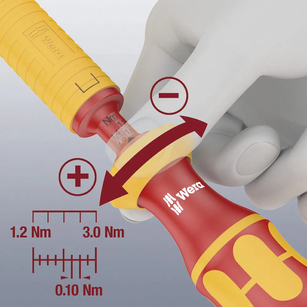Adjustable 1,000V insulated VDE torque screwdriver set containing 14 Kraftform Kompakt VDE interchangeable screwdriver blades. The torque range of 1.2 to 3.0 Newton Metres is quick and easy to change without any special tools. Distinctly audible and noticeable excess load signal when the pre-set value is exceeded, and unlimited torque for manual loosening jobs. Each Kraftform Kompakt VDE tool has been tested individually to 10,000 volts, in accordance with DIN EN 60900 (IEC 60900:2004). This ten-times-higher testing load guarantees safe working at their maximum permitted load of 1,000 volts. Accuracy ± 6% (EN ISO 6789). This 15 piece set features a range of the Kompakt VDE Extra-Slim interchangeable blades, ideal for use with RCBO’s, spring terminals or other components featuring recessed screws, it also comes with a robust belt pouch, keeping them safe and always to hand.