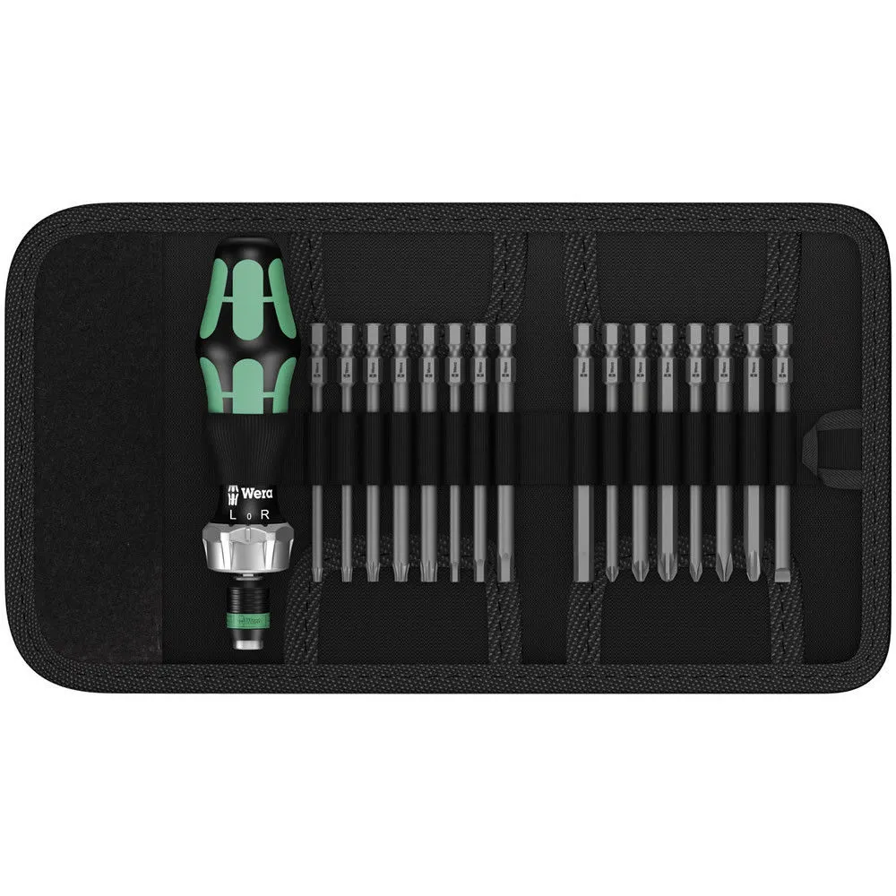 A new generation in service tools. Specially developed for mobility, flexibility and versatility. This series offers both power and hand screwdriving capabilities. In high quality hook and loop fastening belt loop pouch, carrying this tool is easy. 16 high quality 89mm long screwdriver bits with a quick release bit holding handle. Wera’s Hex screwdriver bits feature the patented Hex-Plus® profile, this allows the user to apply up to 20% more torque without damaging the fastener.