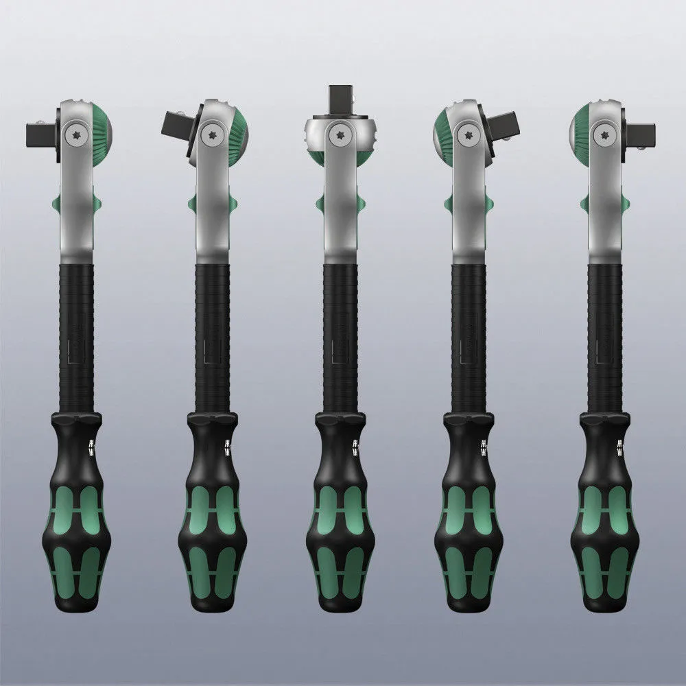 The ¼” Zyklop Ratchet from Wera, thanks to “flywheel” head design and freewheel spin-sleeve increase operational speed up to 5 times. The high precision gearing provides a small return angle of 5° and allows work in the most confined spaces. The swivelling ratchet head offers five different positions. Sockets and accessories are locked on and released by press-button in any position.